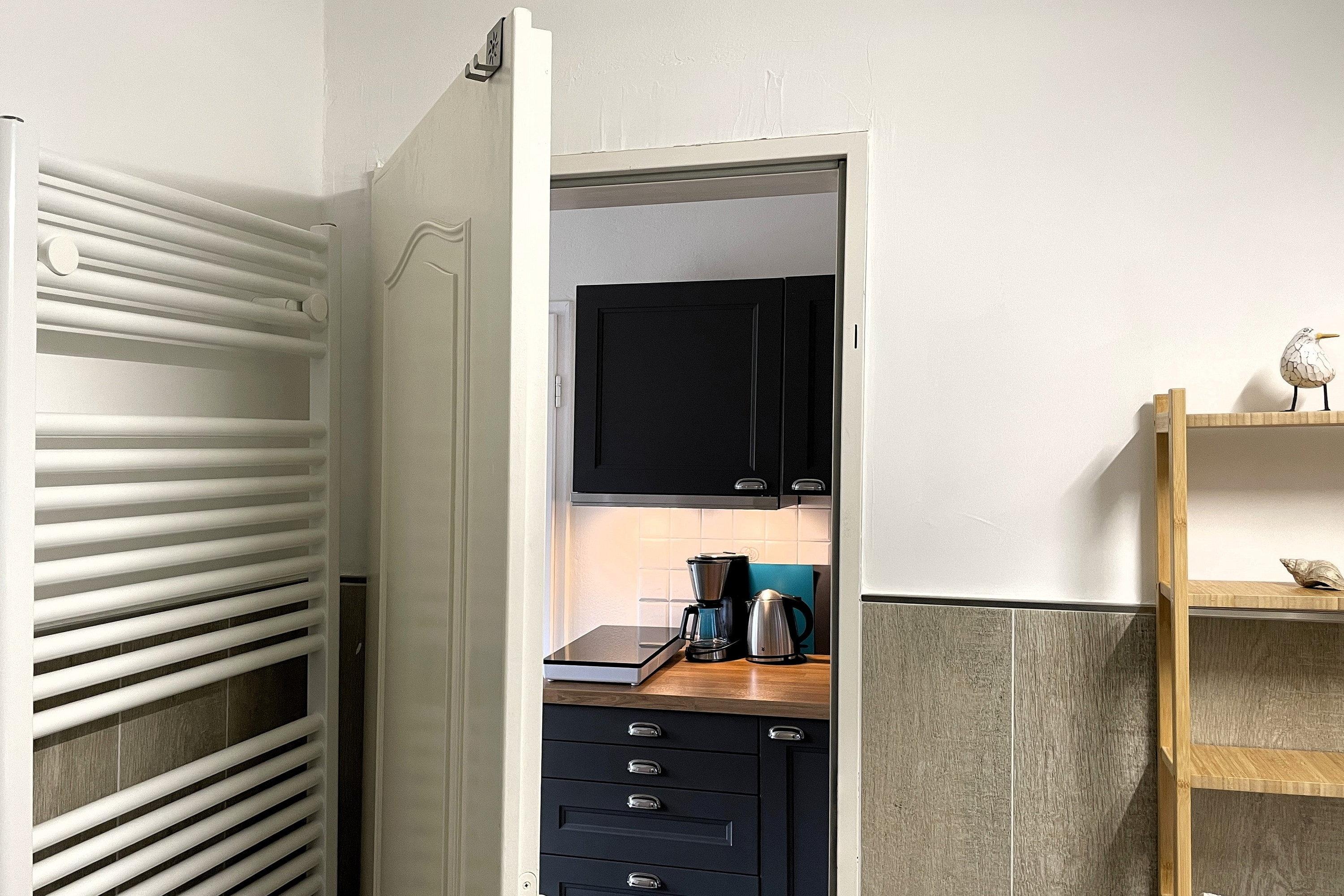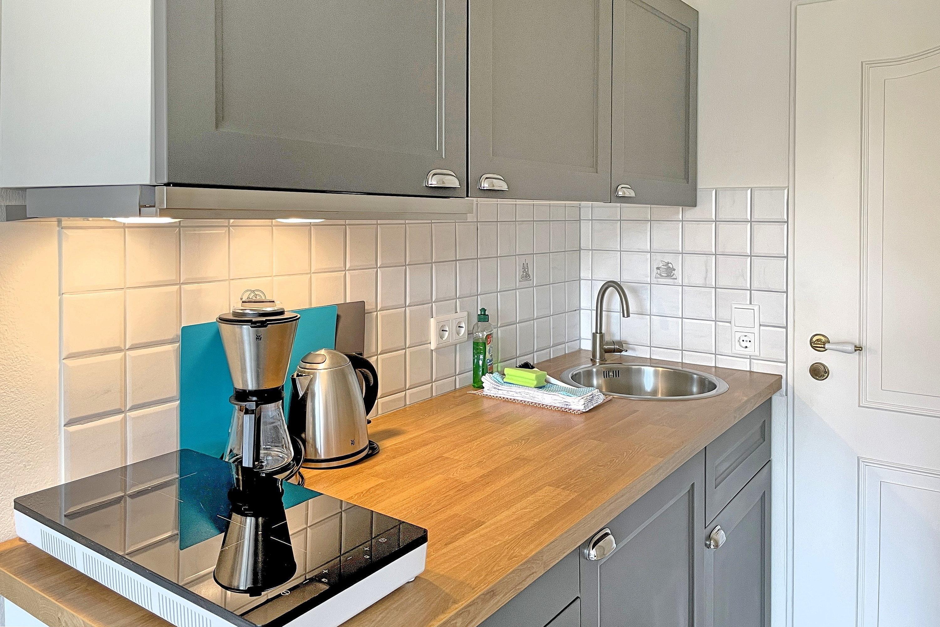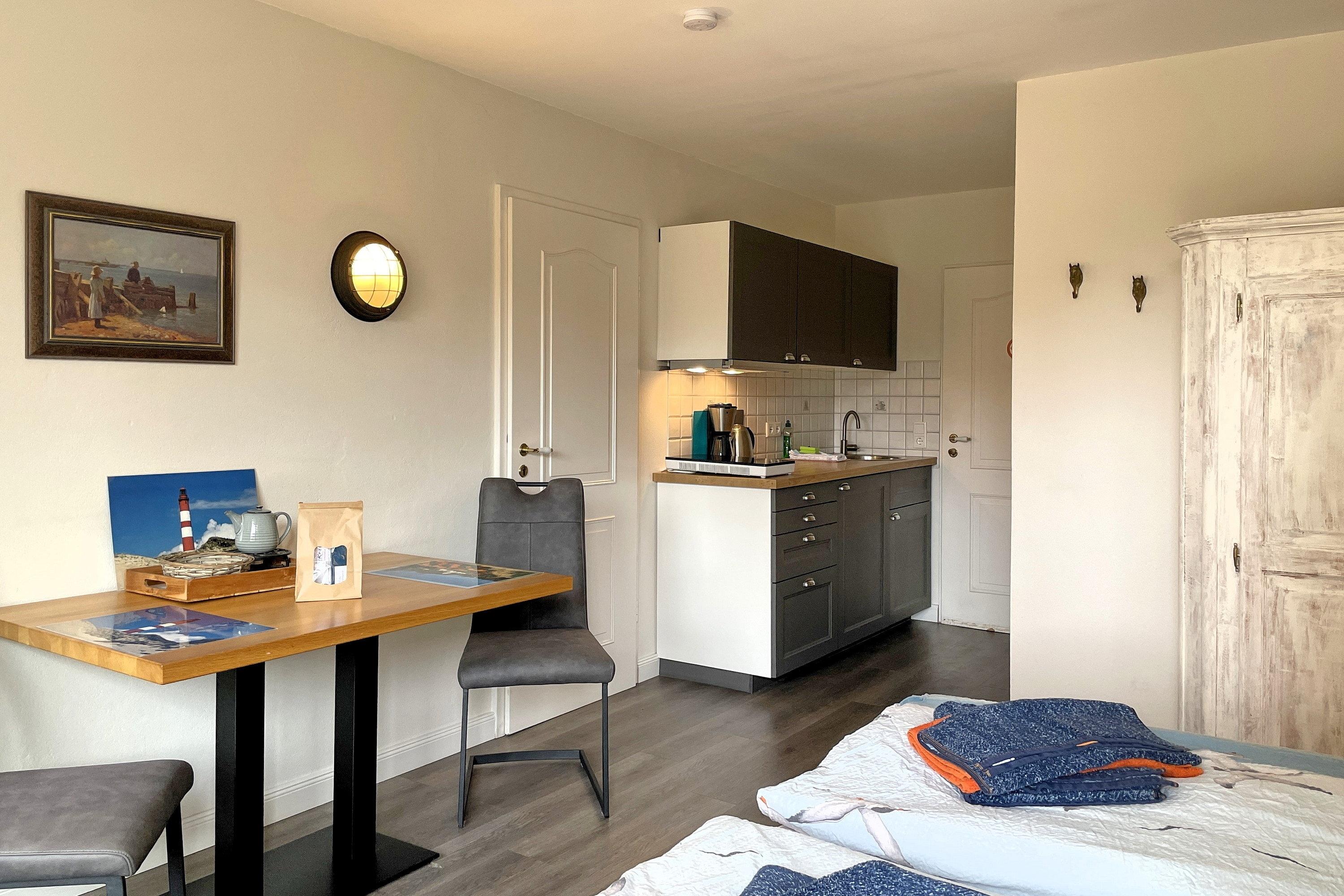 Herzlich Willkommen auf Amrum und in unserer gemütlichen Ferienunterkunft Huus Waterkant 02. Diese liebevoll gestaltete Unterkunft bietet Ihnen genau den richtigen Rahmen für einen erholsamen und entspannten Urlaub. Im Mittelpunkt steht das einladende Wohn-/Schlafzimmer mit einem komfortablen Doppelbett für zwei Personen, das Ihnen erholsame Nächte garantiert. Ein geräumiger Schrank sorgt für ausreichend Stauraum, während die integrierte Küchenzeile kleine kulinarische Verwöhn-Momente ermöglicht. Der praktische Esstisch mit Stühlen lädt zum gemeinsamen Essen oder geselligen Spieleabenden ein.