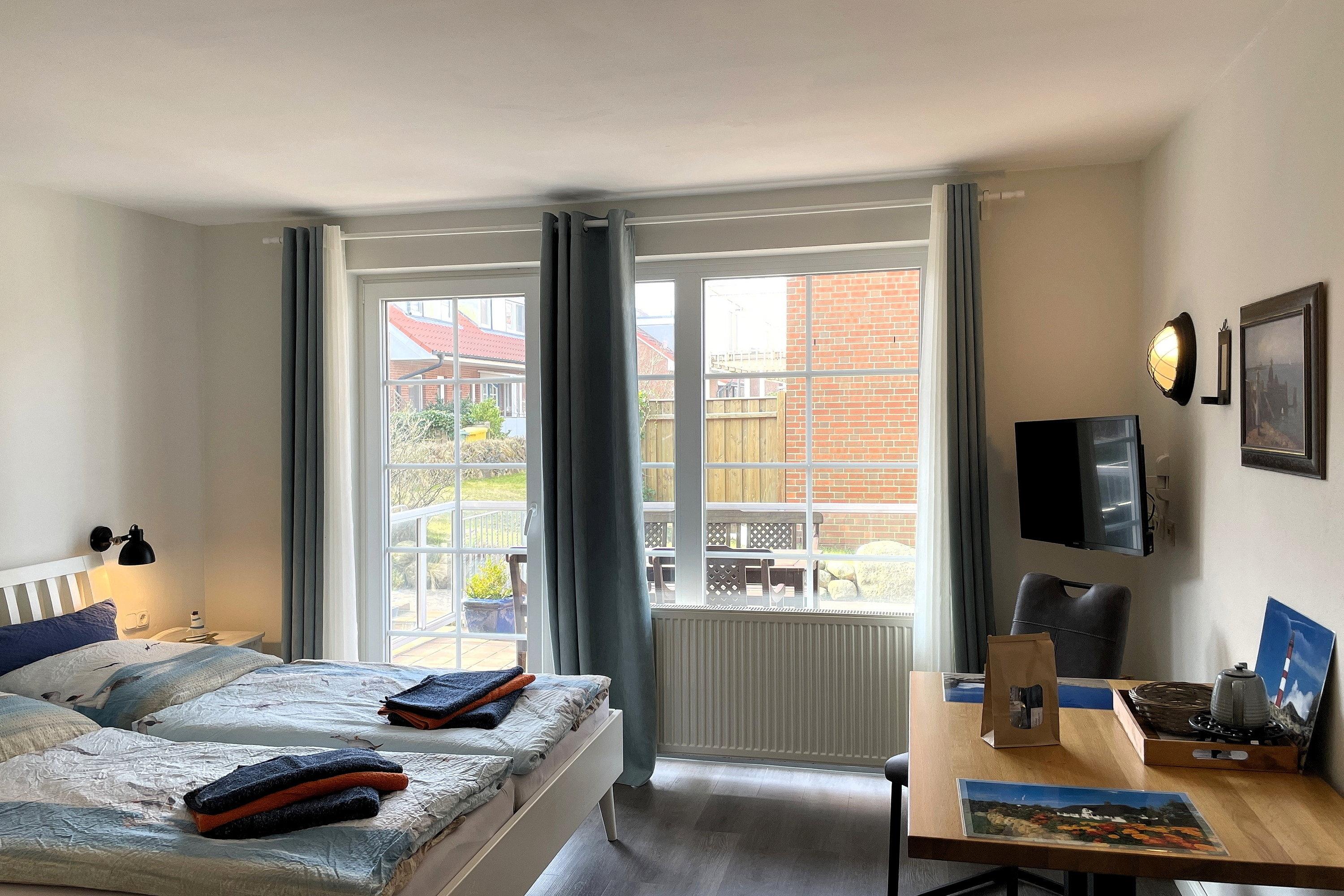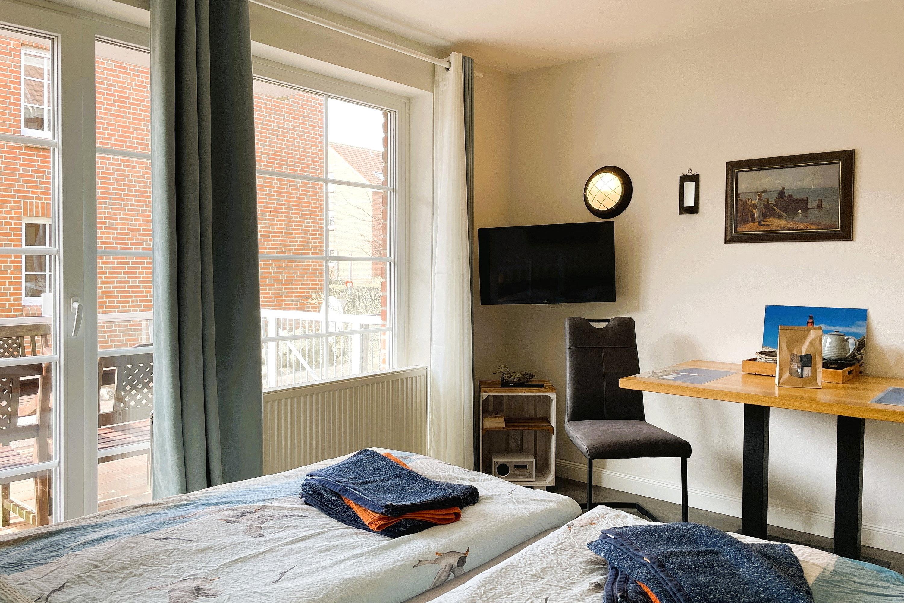 Ein absolutes Highlight ist der Balkon, die direkt vom Wohn-/Schlafzimmer zugänglich ist. Von hier aus genießen Sie einen wunderbaren Blick auf die Insel. Die südwestliche Ausrichtung verspricht sonnendurchflutete Nachmittage und zauberhafte Sonnenuntergänge – perfekt für entspannte Momente im Freien. Das moderne, innenliegende Bad mit flacher Dusche, WC und dezenter Lüftung komplettiert den Wohnkomfort. Für zusätzliche Annehmlichkeiten sorgen wir im Untergeschoss: Hier finden Sie für jede Wohneinheit ein eigenes Gefrierfach und können Waschmaschine und Trockner kostenlos nutzen. So wird Ihr Aufenthalt nicht nur gemütlich, sondern auch besonders praktisch. Unsere Ferienwohnung ist mehr als nur eine Unterkunft – sie ist Ihr persönlicher Rückzugsort, der Geborgenheit, Komfort und Urlaubsfreude perfekt vereint. Wir heißen Sie herzlich willkommen und freuen uns darauf, Ihnen einen unvergesslichen Aufenthalt zu bereiten!