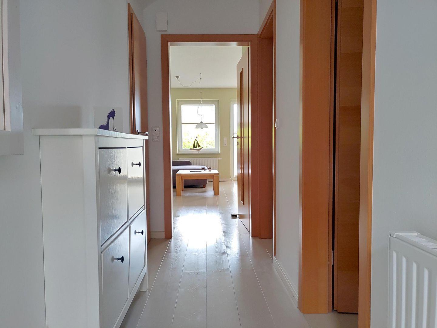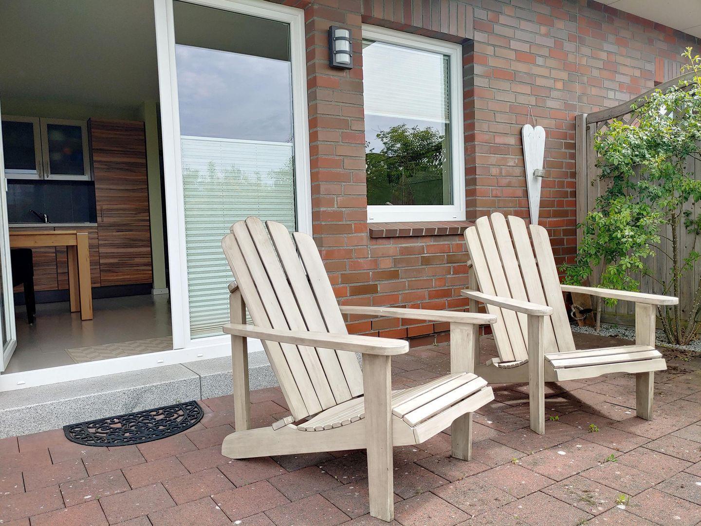 Die Wohnung verfügt über einen Wohnraum mit WLAN, Sat-TV und offener Küche, ein Schlafzimmer, ein Badezimmer mit Dusche und WC; eine offene Süd-West-Terrasse mit 2 Gartenstühlen (April bis Oktober) und blick auf die Dünen und einem eigenen Carport.