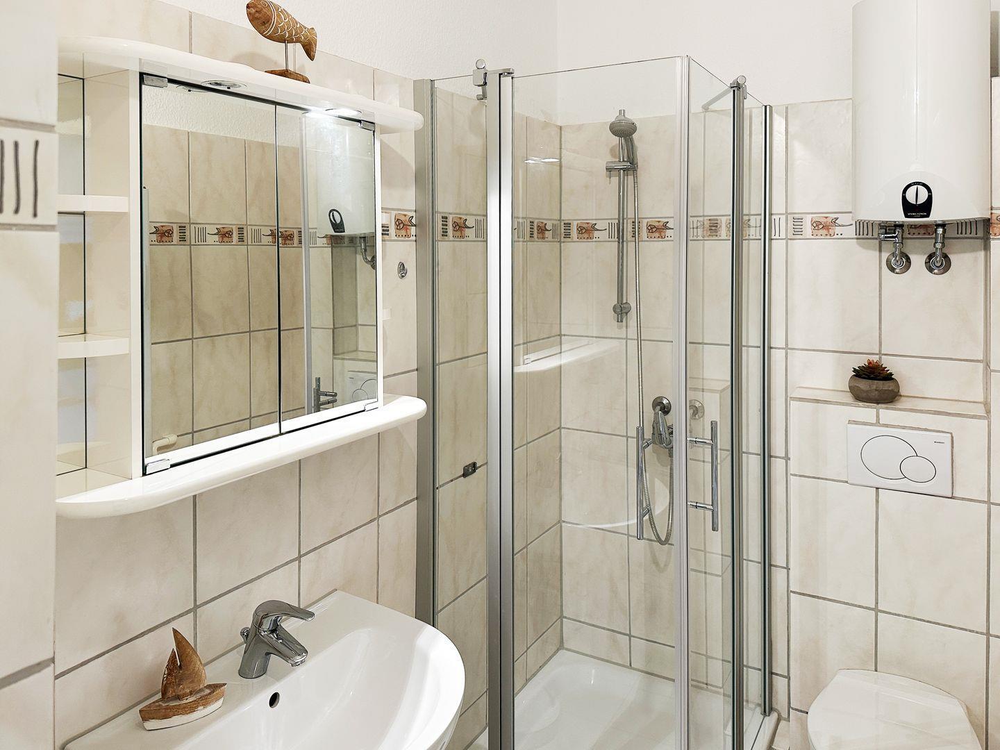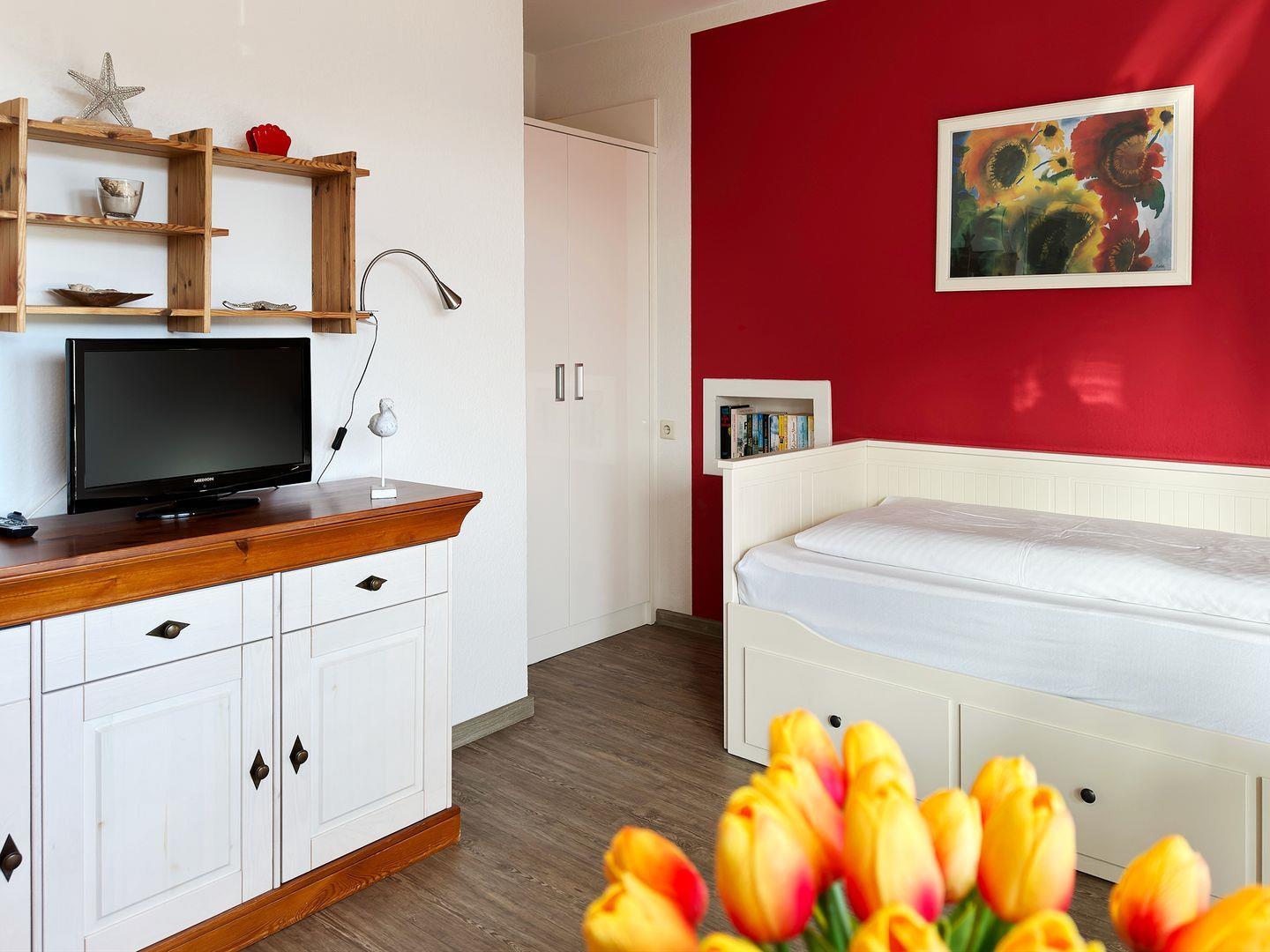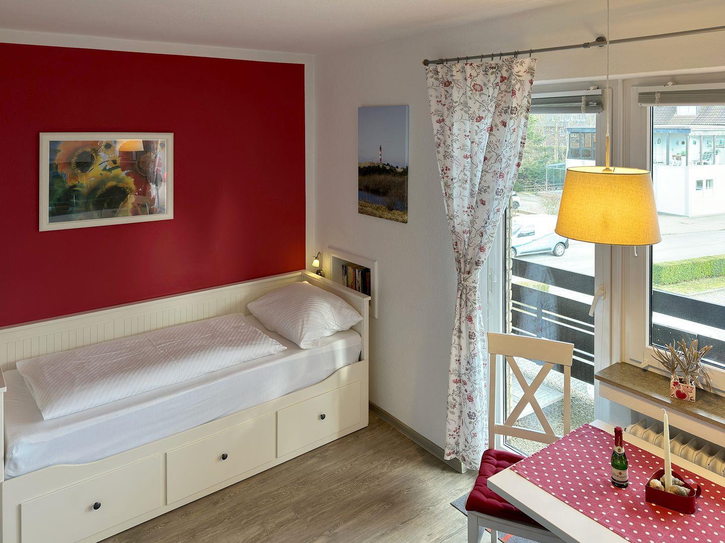 Die kleine Ferienwohnung "Wattenmeer" verfügt über einen kombinierten Wohn- Schlafraum mit WLAN, TV und offener Küche, ein Badezimmer mit Dusche und WC; einen überdachten Süd-Balkon (Loggia) mit Gartenmöbeln (April bis Oktober).