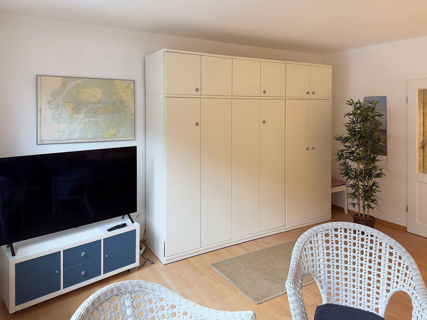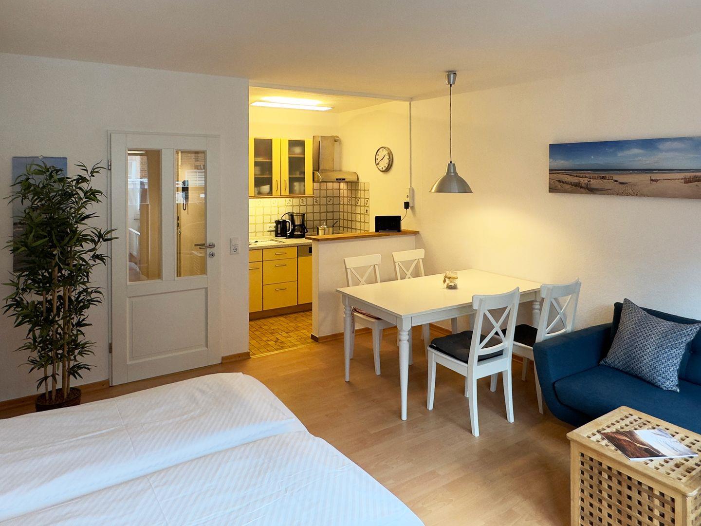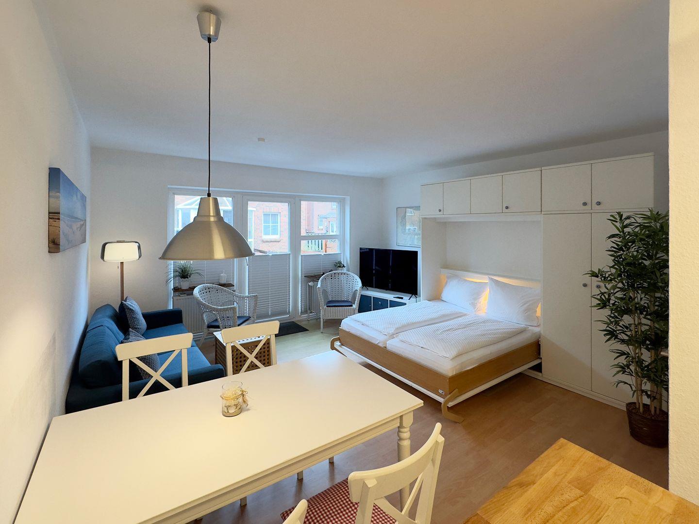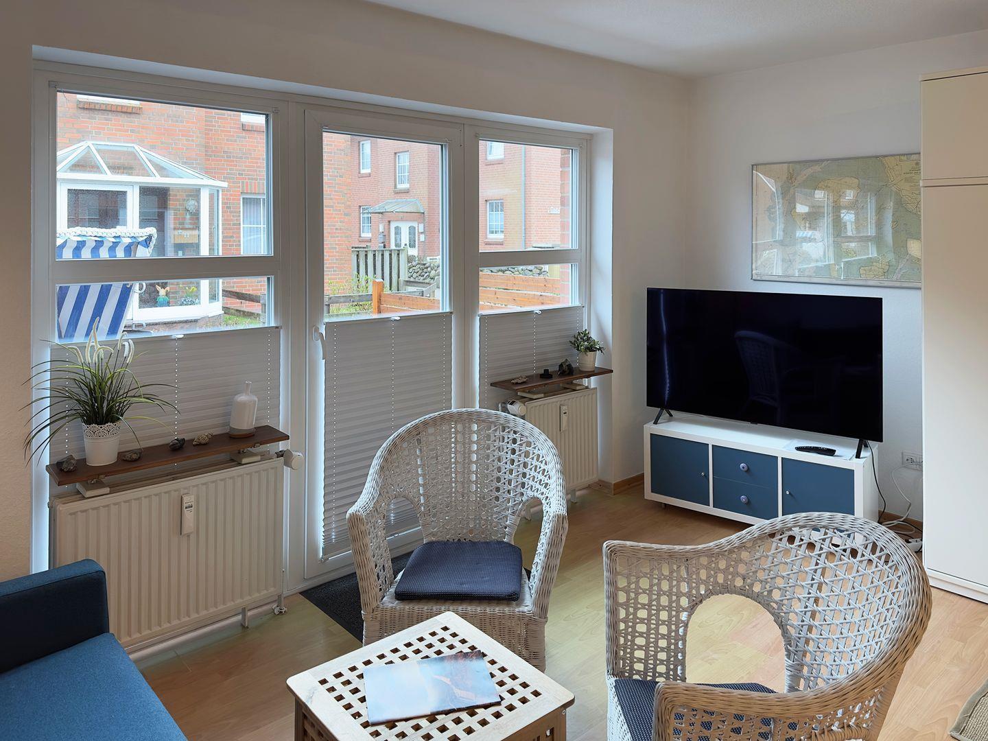 Die Wohnung verfügt über 1 Wohnraum mit WLAN, Sat-TV und offener Küche, 1 Schlafzimmer, 1 Badezimmer mit Dusche und WC; eine Süd-Terrasse mit Gartenmöbeln und Strandkorb (April bis Oktober); PKW-Stellplatz vorhanden.