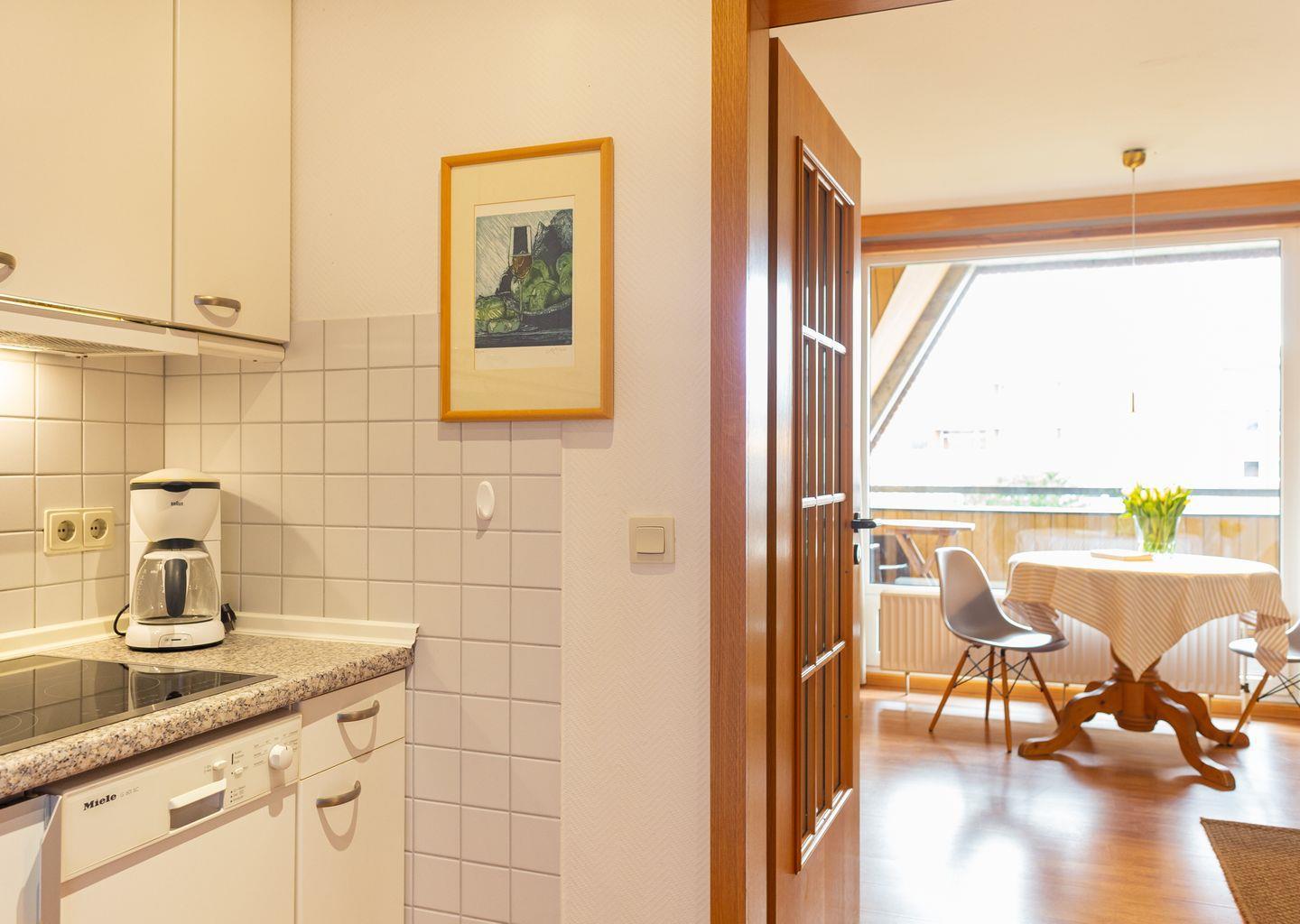 Die Wohnung verfügt über ein Wohnzimmer mit separatem Schlafzimmer mit Boxspringbett, eine voll ausgestattete Küche mit Geschirrspüler, ein Duschbad, einen Balkon mit Meerblick und WLAN. Wohnzimmer und Schlafzimmer sind jeweils mit einem Flachbild TV Gerät ausgestattet. Ein Parkplatz ist ebenfalls vorhanden. Gepflegte Fahrräder stehen zu Ihrer freien Nutzung bereit.