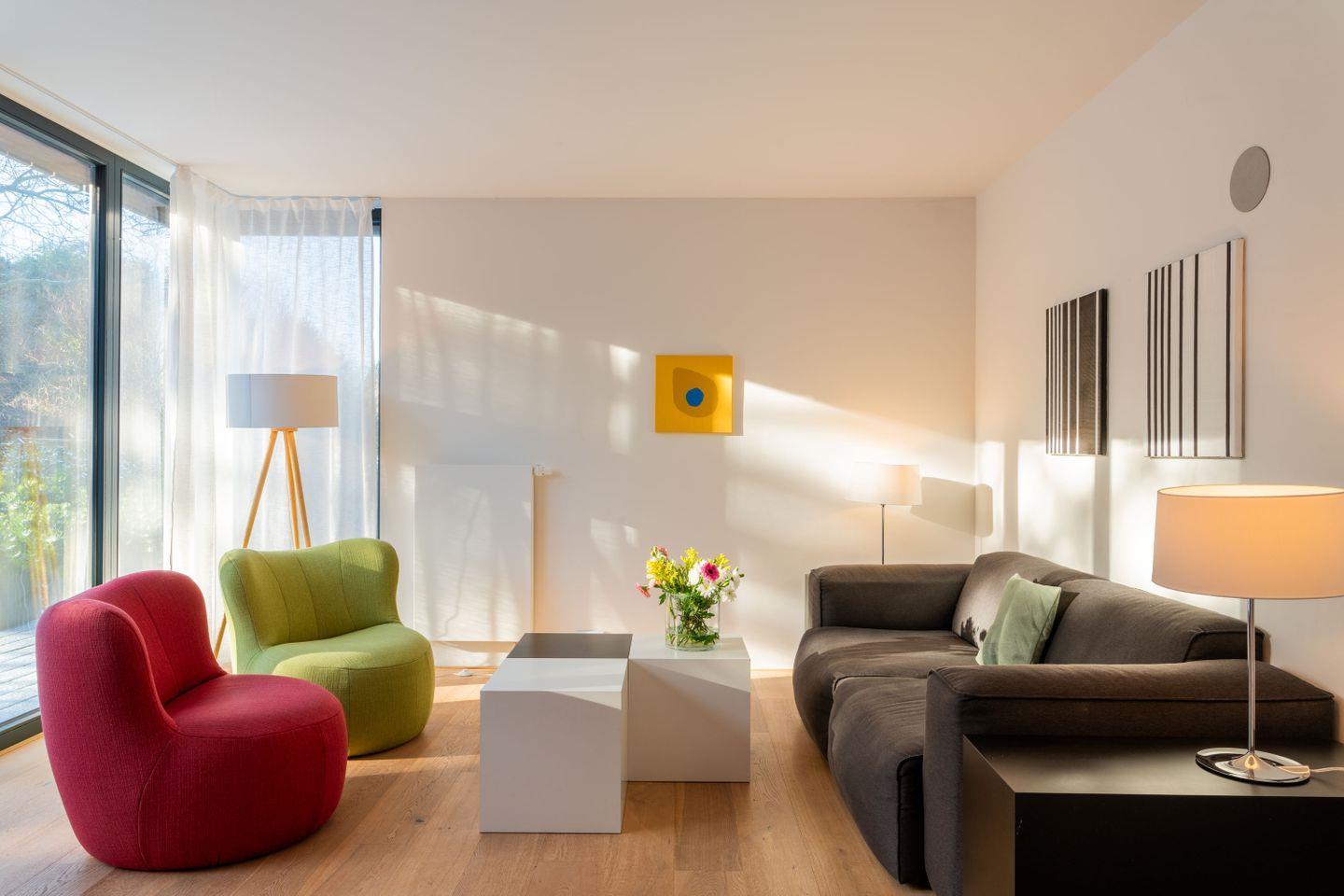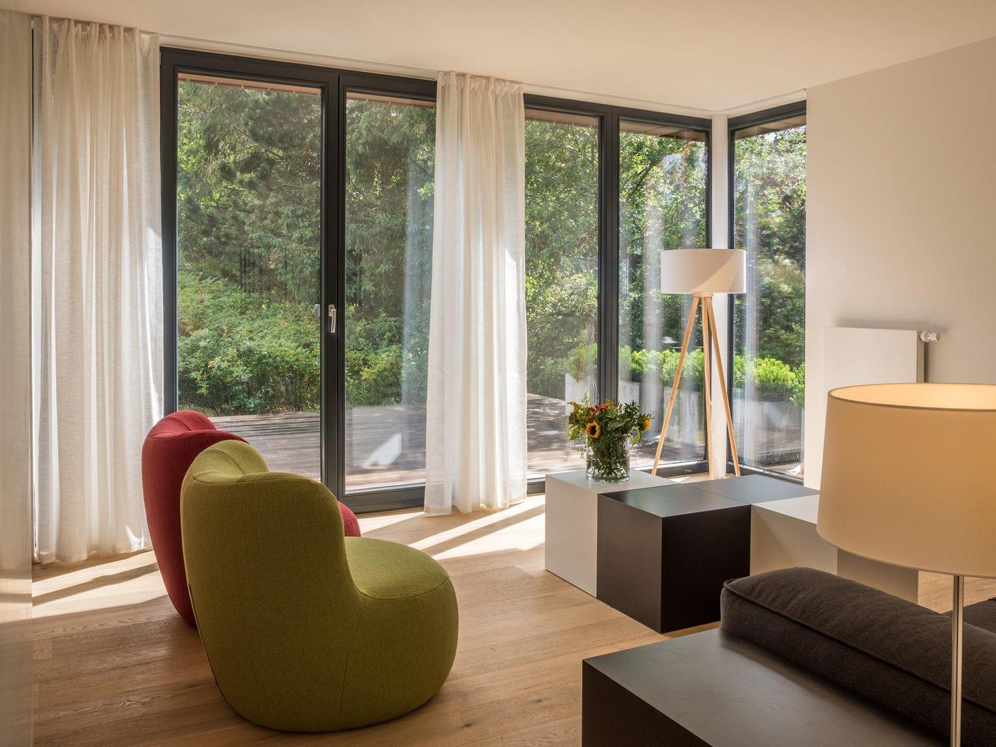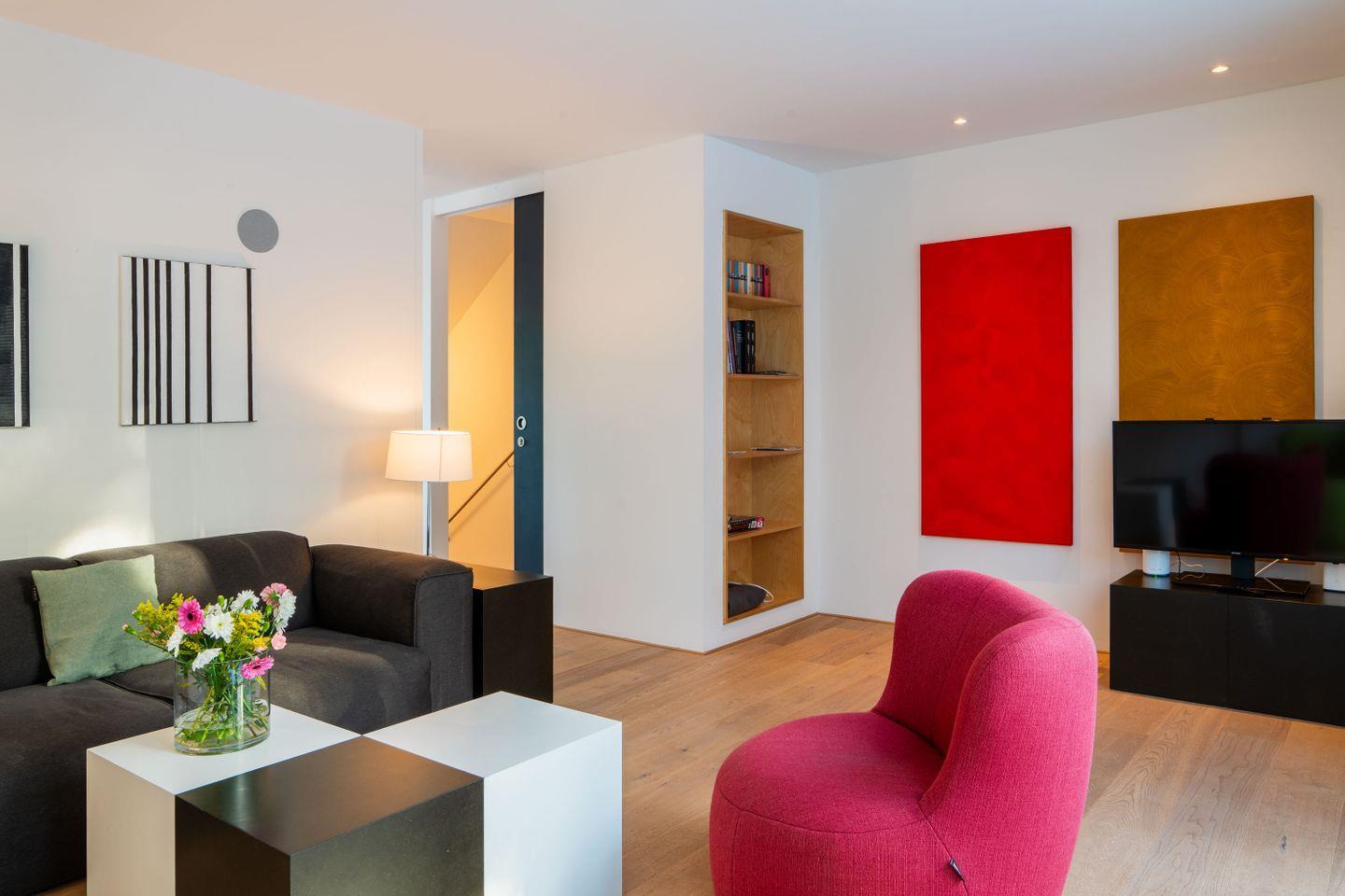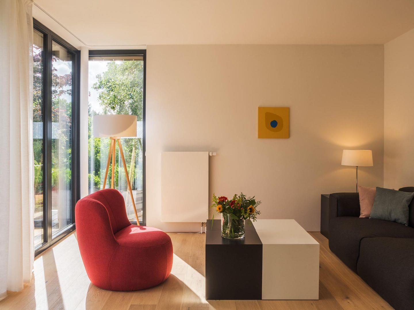 - Wohnraum mit Sofa, Sesseln und TV-Flachbildschirm