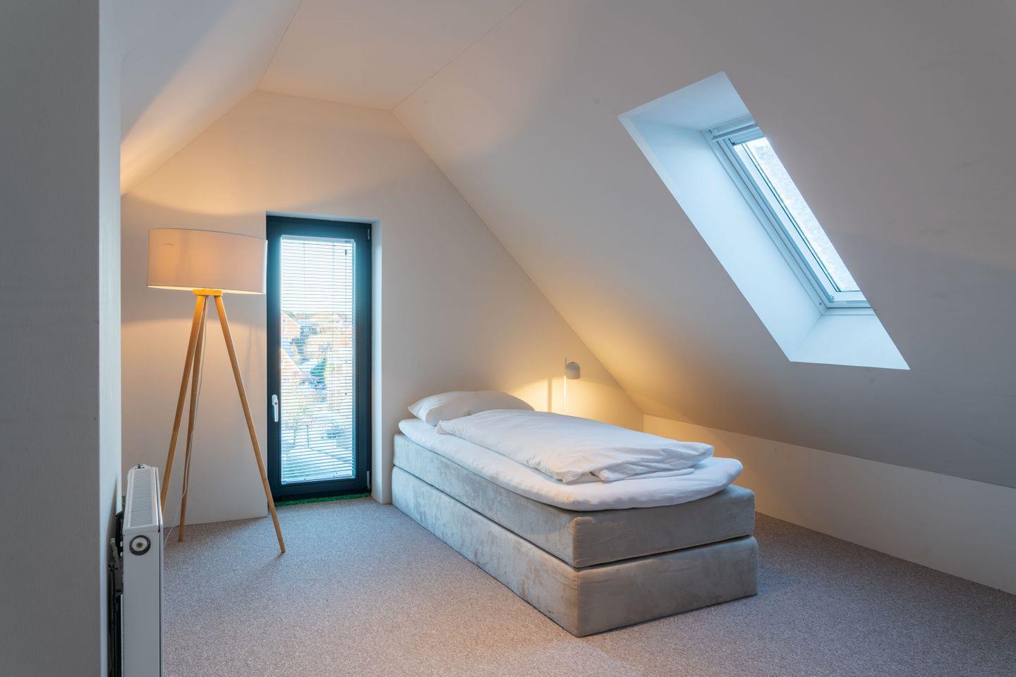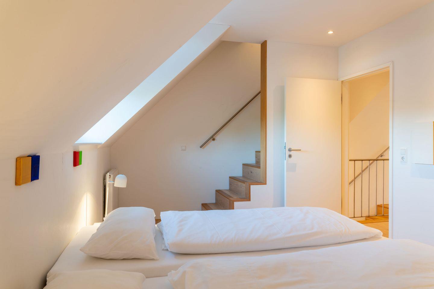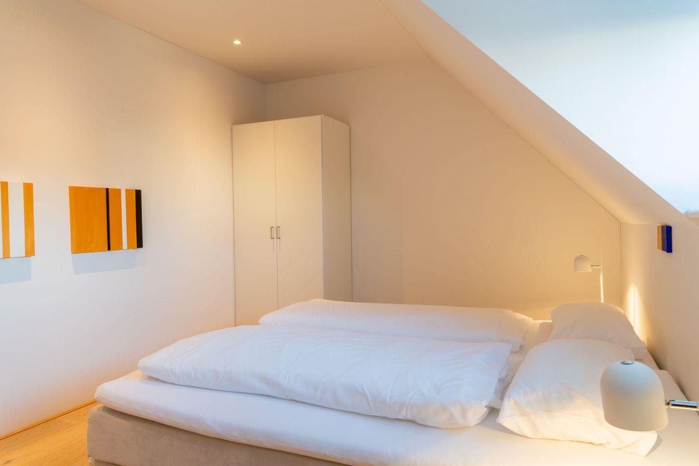 Das Dachgeschoss hat einen Balkon und 2 Schlafräume mit Boxspringbetten und Einbauschrank. Ein elegantes Bad mit Dusche, Badewanne und WC komplettiert das Raumangebot. Die Galerie im Spitzboden des Hauses mit maximal 2 Schlafplätzen ist über eine Treppe mit dem Dachgeschoss verbunden. Ein zusätzliches separates WC befindet sich im Eingangsgeschoss.