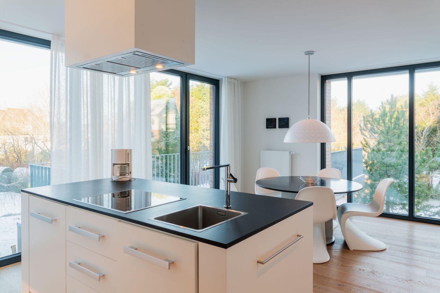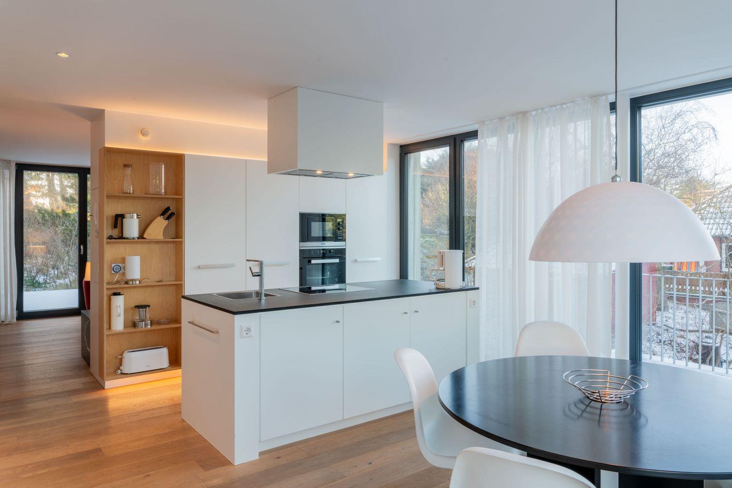 Das moderne Architektenhaus mit einer hochwertigen Innenausstattung wird von der Mittelstraße über einen Eingangshof mit Carport erreicht. Der Grundriss ist der Topografie der Düne angepasst und umfasst 3 Wohngeschosse. Die große Wohnung im Erd- und Dachgeschoss wird über eine Treppe erreicht. Im Erdgeschoss befindet sich ein großzügiger Wohnbereich der über raumhohe Fenster eine direkte Verbindung zu den Außenbereichen herstellt. Auf der Südseite zur großen Gartenterrasse, an der Ost- bzw. Westseite zum Dachgarten mit Blick auf den Inselpark. Die Räume sind lichtdurchflutet und harmonisch gestaltet.