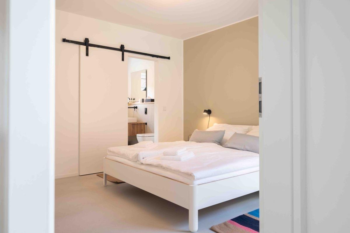 Schlafzimmer mit anliegendem Badezimmer und Infrarotsauna