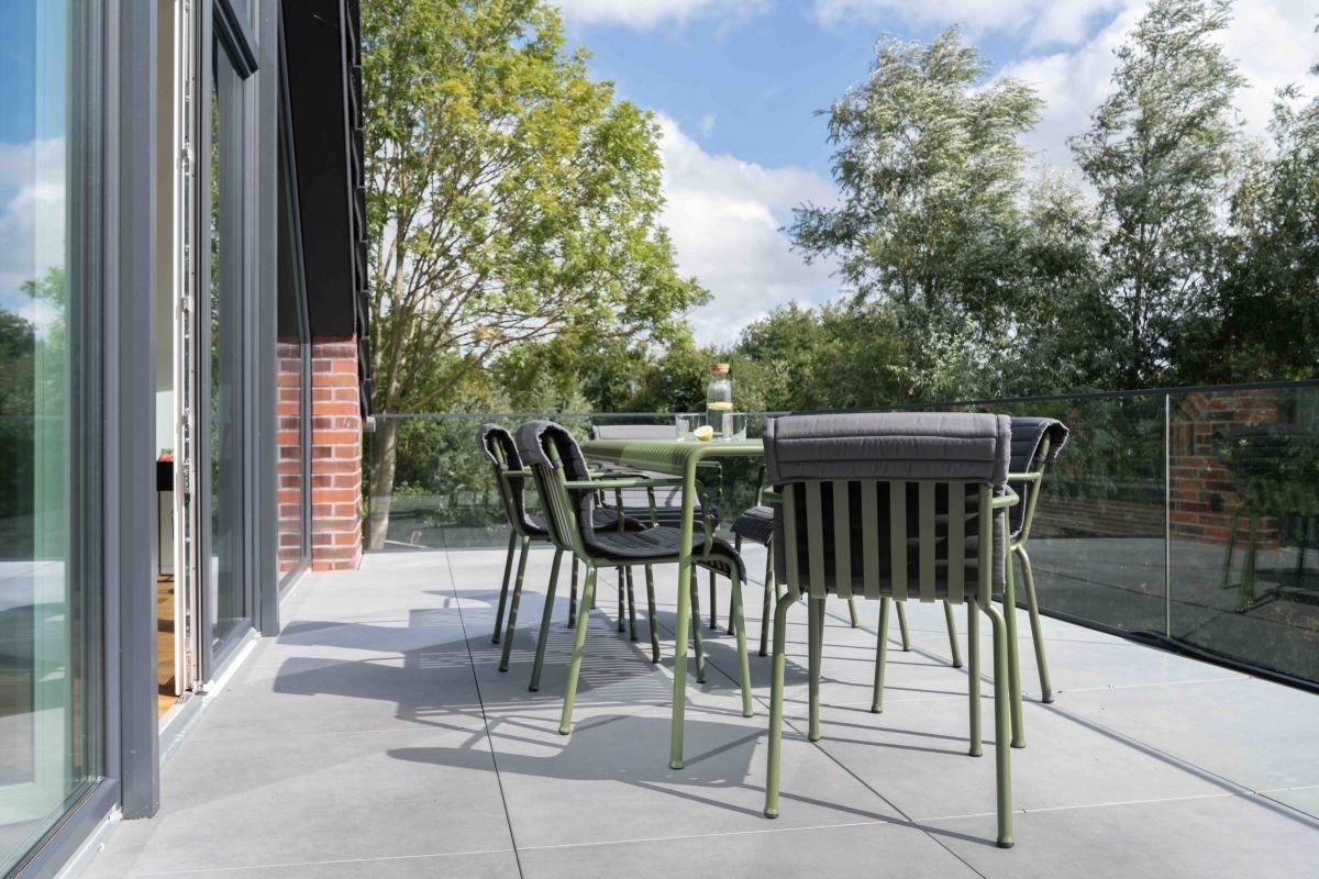 Ihr habt die Wahl zwischen einem malerischen Blick in die Ferne oder einem gemütlichen Lagerfeuer im Garten. Unsere Ferienhäuser bieten einen großen Balkon mit Sitzgarnitur und Tisch sowie eine Feuerstelle im Garten mit Sitzbänken aus Beton.
