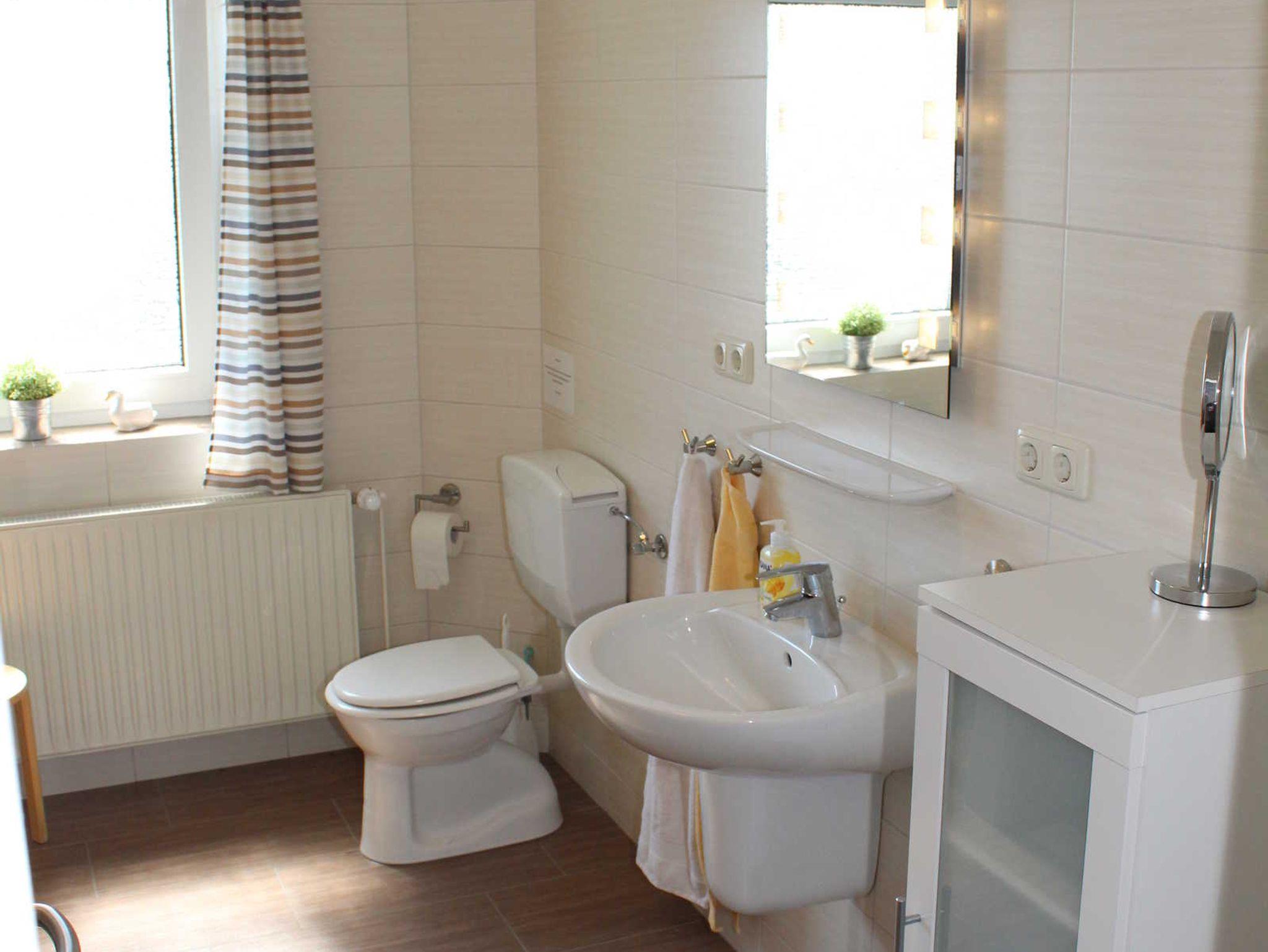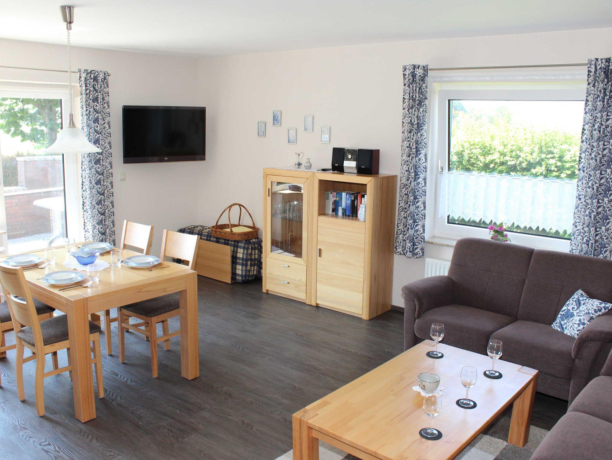 Im Erdgeschoss des Privathauses direkt beim Hof befindet sich die 95 qm große Ferienwohnung in Süd-West Lage für 2 - 6 Personen. Sie haben direkt von der Wohnstube aus Zugang zur eigenen Südterrasse mit Gartenmöbeln. Die Wohnung wurde renoviert und modern und komfortabel eingerichtet. Im Wohnraum befinden sich eine Einbauküche, ein Essplatz und eine Couchecke. Zur Ausstattung gehören Geschirrspüler, Mikrowelle, Kühlgefriergerät, Herd mit Ceranfeld, Backofen, elektrische Kleingeräte, Flachbildfernseher und CD-Radio.