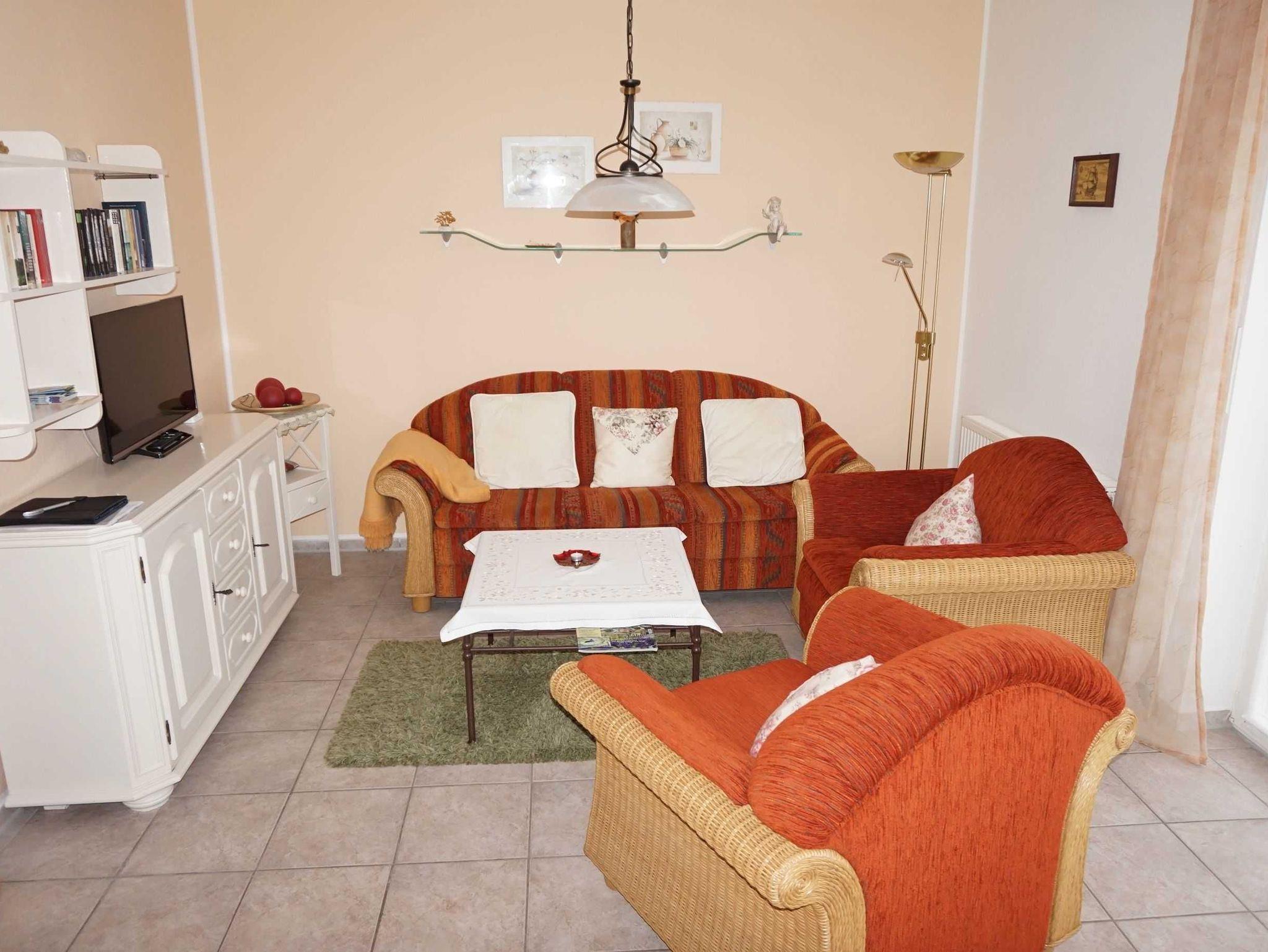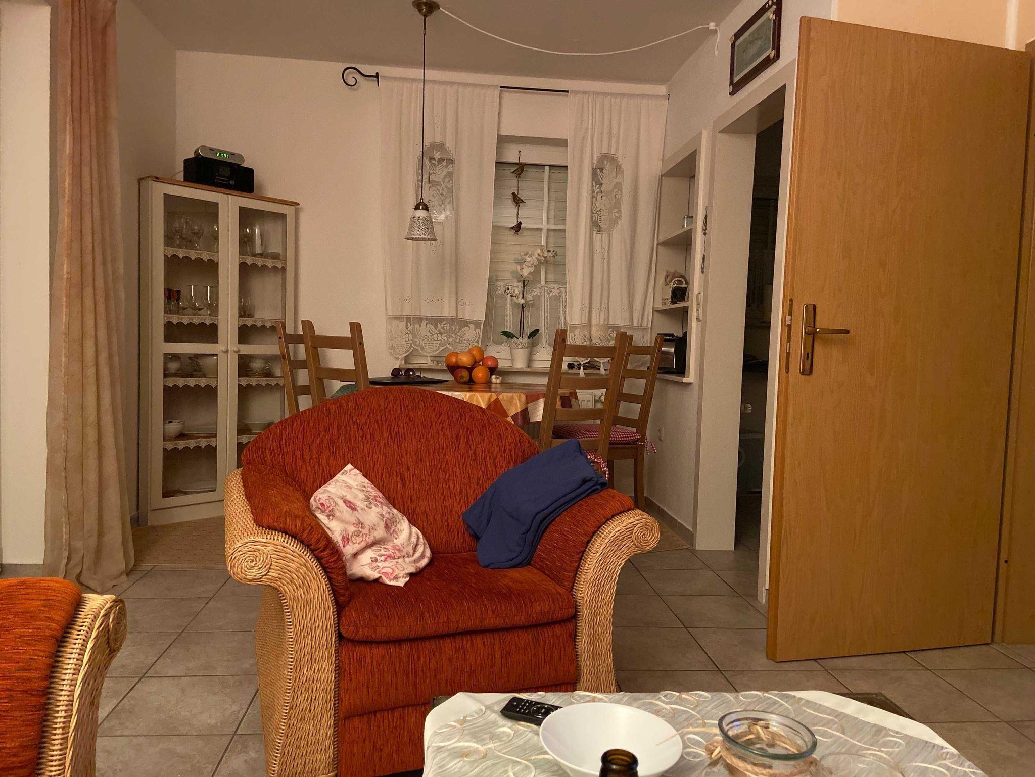 Erdgeschoß-Ferienwohnung für 1-4 Personen. 1 Schlafzimmer , 1 Kinderzimmer mit 140cm breitem Klappbett , Wohnküche, Dusche/WC. Terrasse.