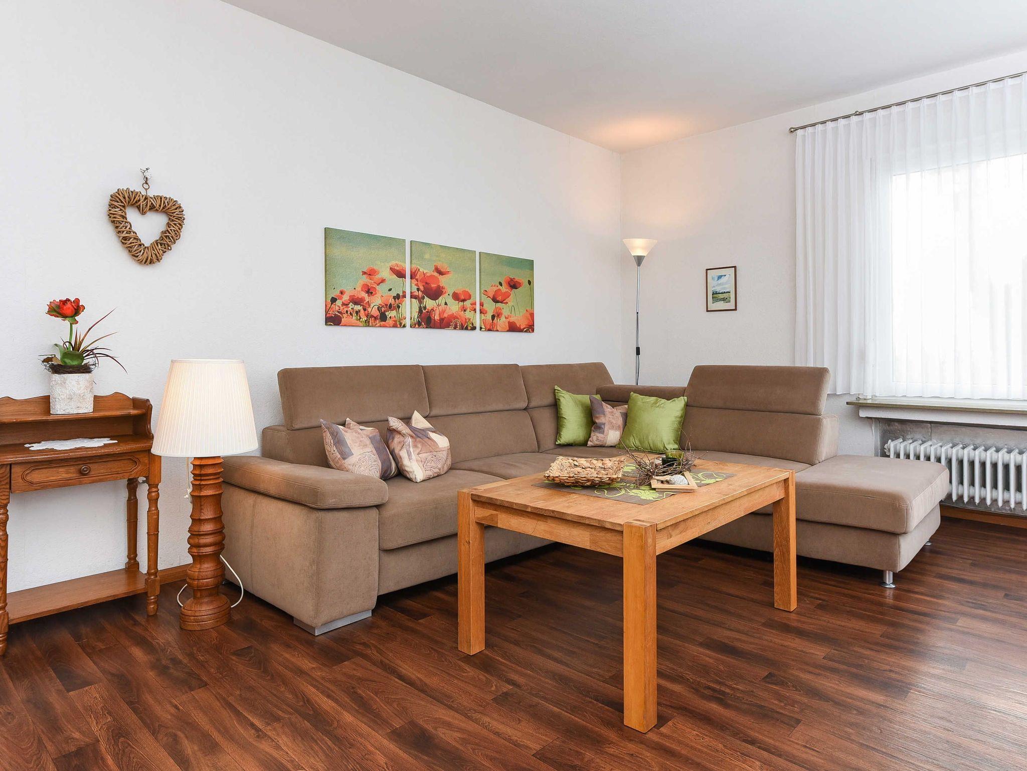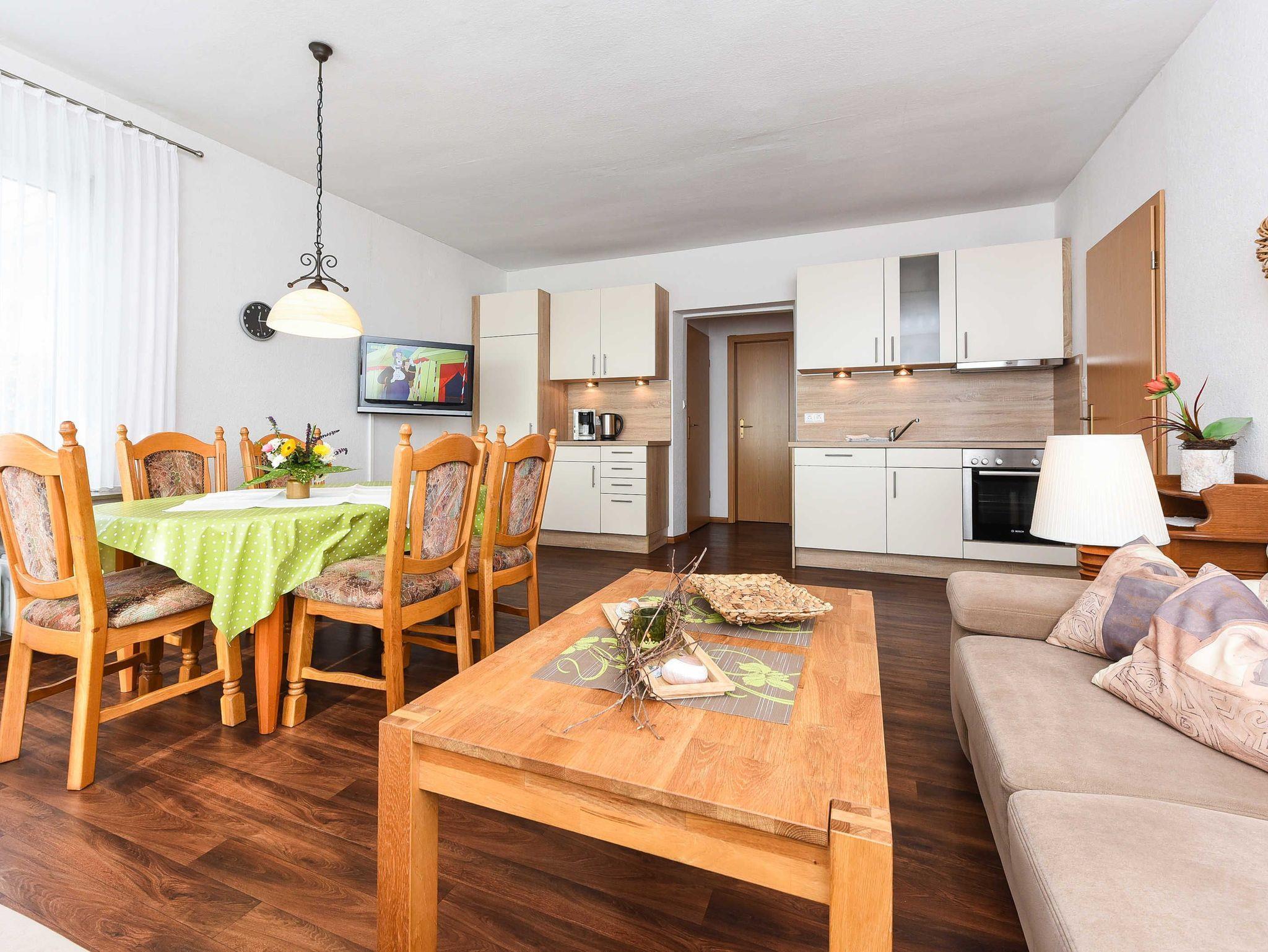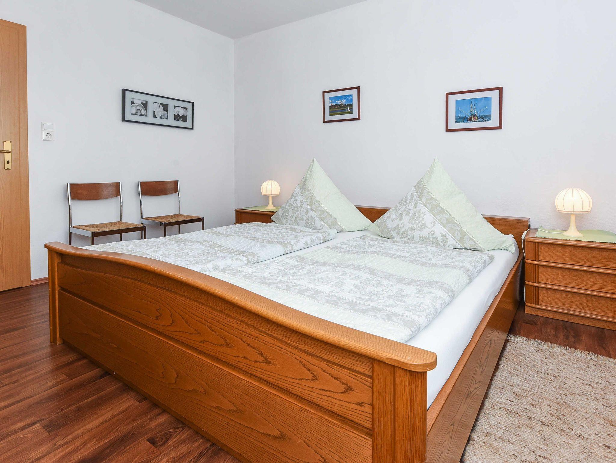 Größe ca. 70 Quadratmeter, Wohnzimmer mit Essgruppe, Küche im offenen Flurbereich integriert, Schlafzimmer, zweites separates Schlafzimmer/Kinderzimmer, Badezimmer mit Dusche, Waschtisch und WC, Erdgeschoss für 2 bis 5 Personen und zusätzlich ein Kleinkind.