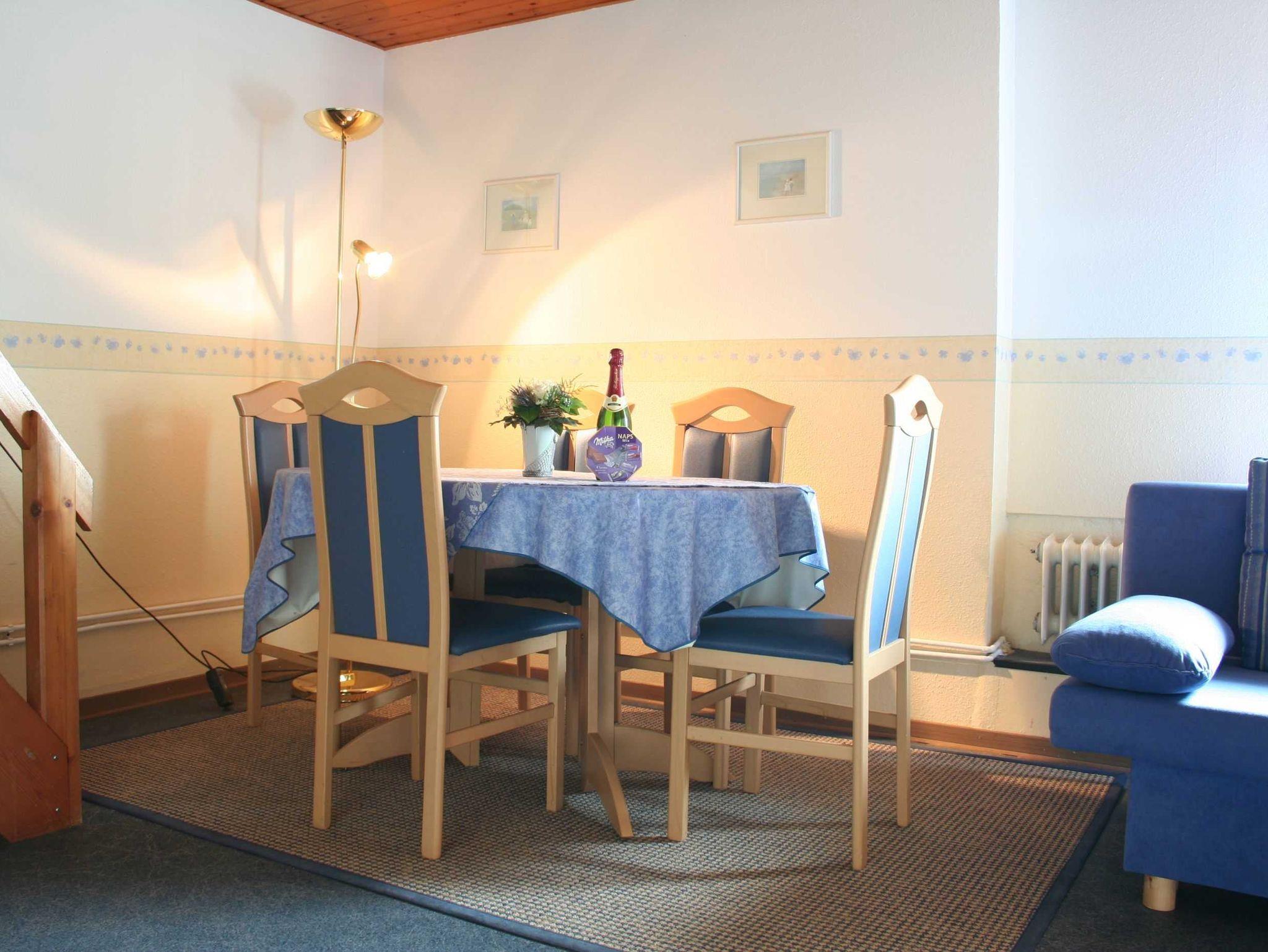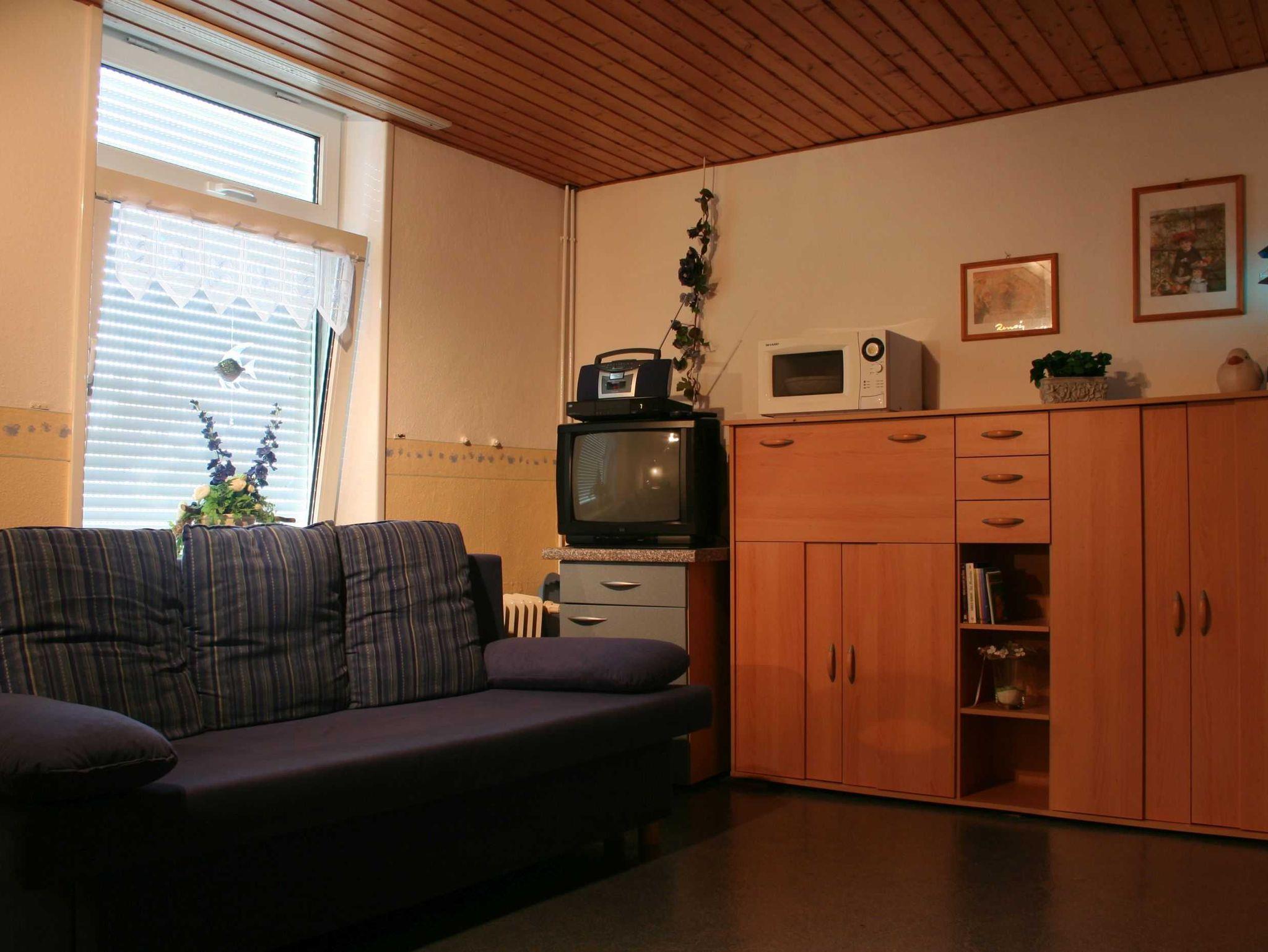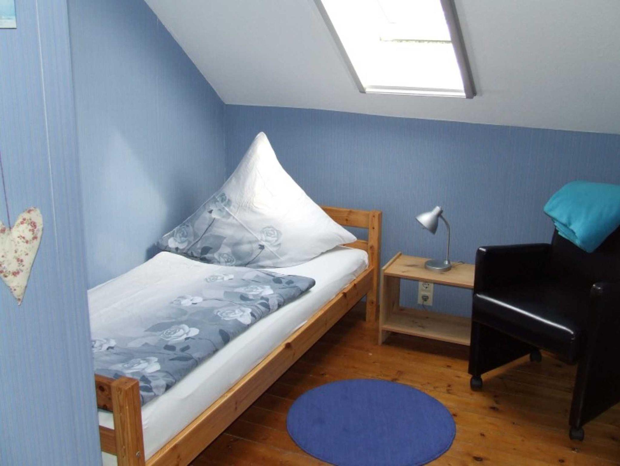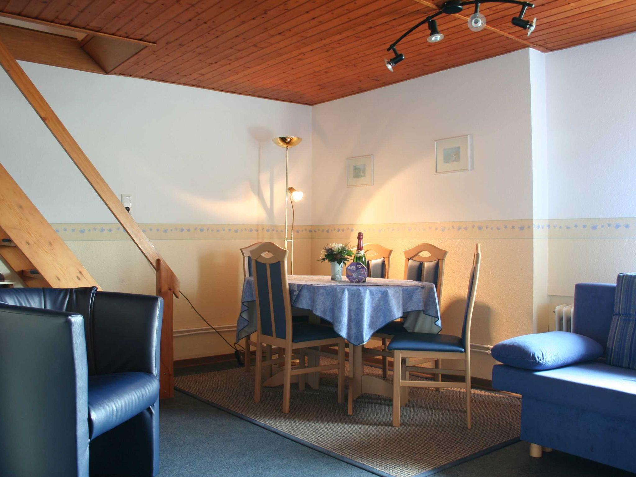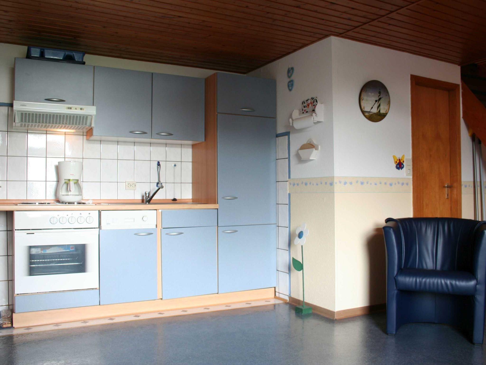 Im Obergeschoss des Hauses befindet sich die komplett eingerichtete, zentral geheizte Ferienwohnung Süd. Im oberen Teil befindet sich das Elternschlafzimmer mit Doppelbett, Kleiderschrank und Babybett. Direkt neben dem Elternschlafzimmer im oberen Teil liegt das Kinderzimmer. Im unteren Teil der Wohnung befindet sich der Wohnraum mit Sitzecke, Sat-TV, Radio und Essecke. Eine vollausgestattete Küchenzeile ( Toaster, Kaffeemaschine, Mikrowelle, Geschirrspüler ) befindet sich ebenfalls im unteren Bereich. Das Duschbad mit WC und Fön komplettiert unsere Südwohnung. Bettwäsche und Handtücher bitte mitbringen.