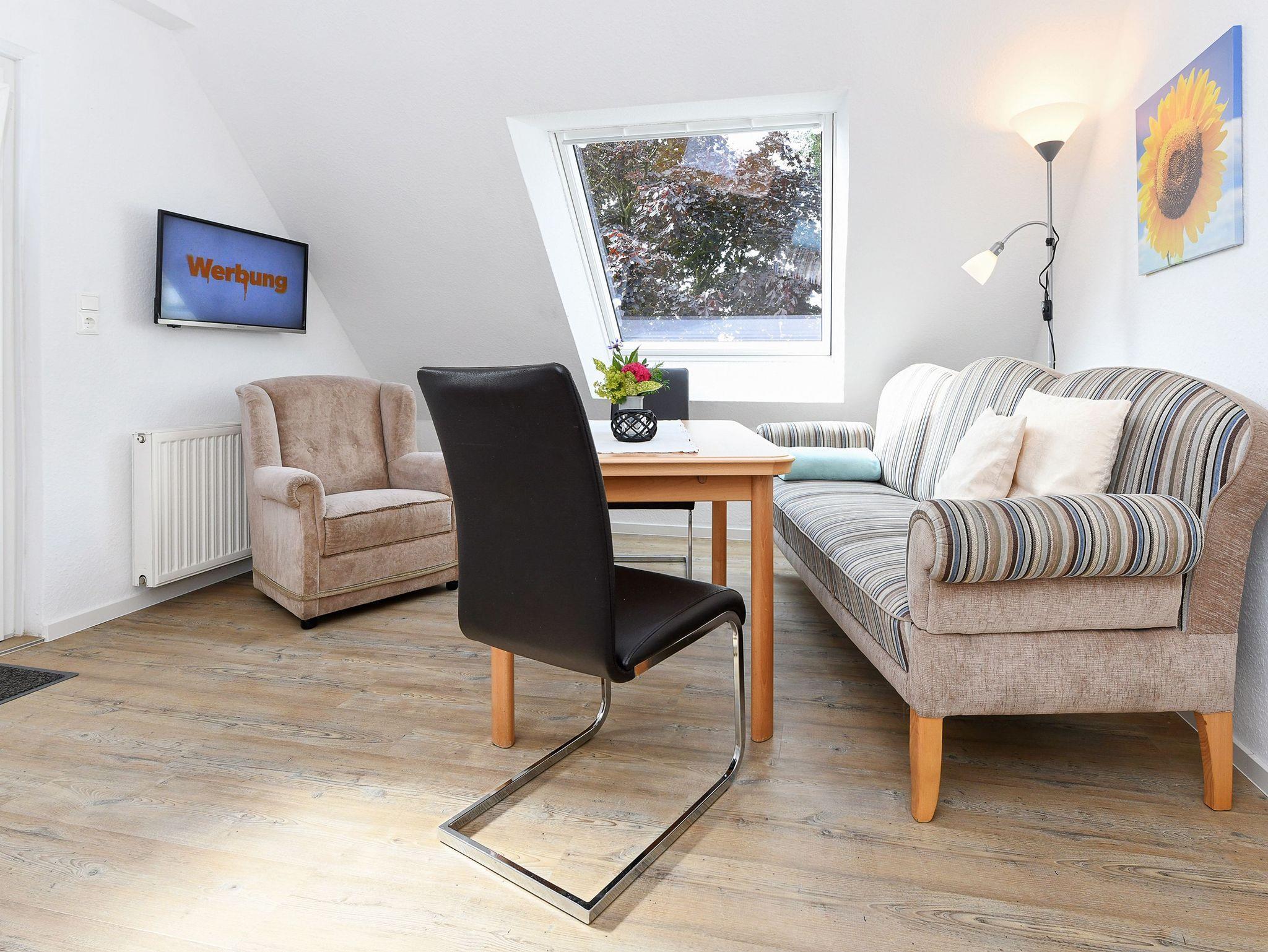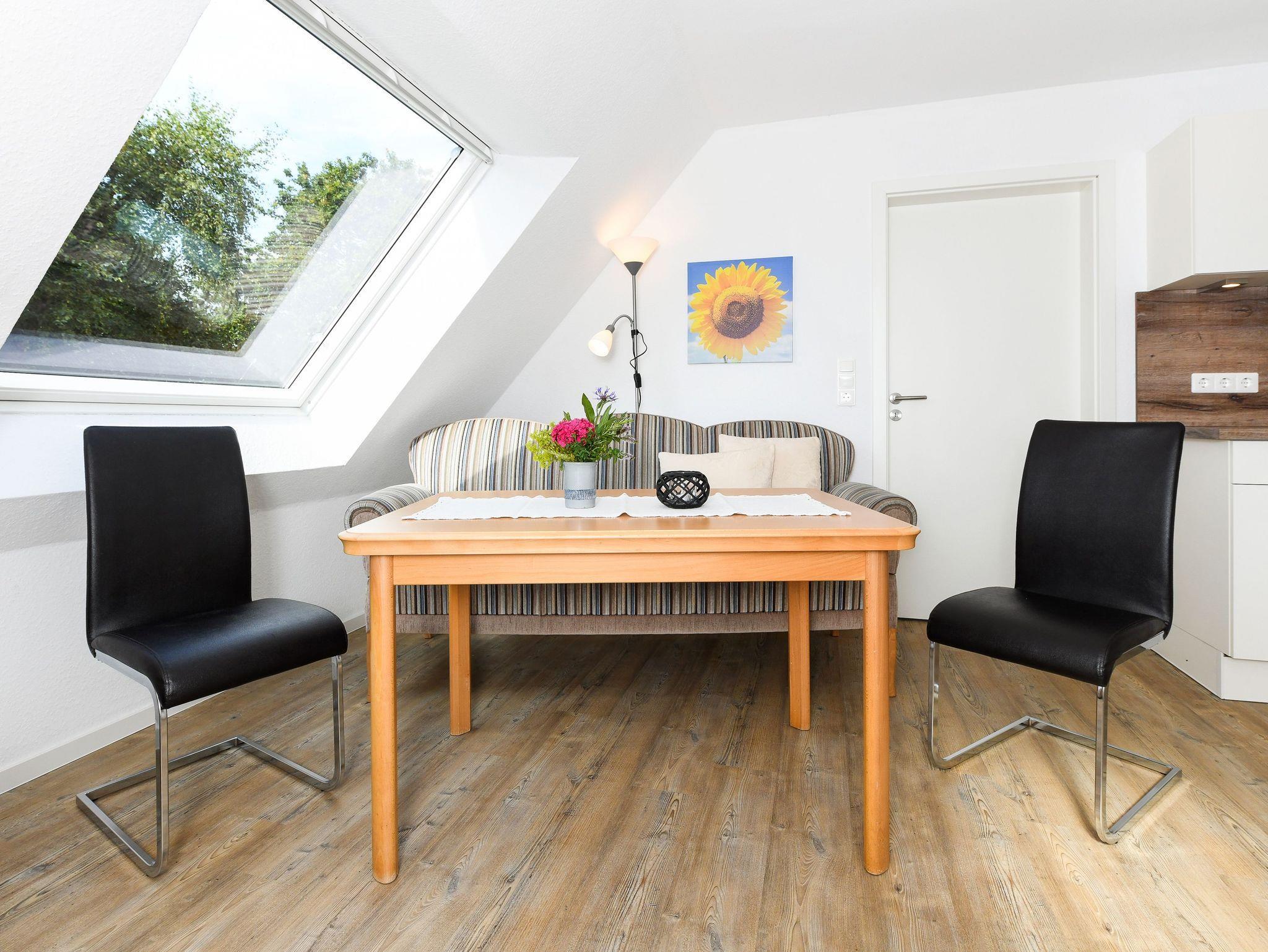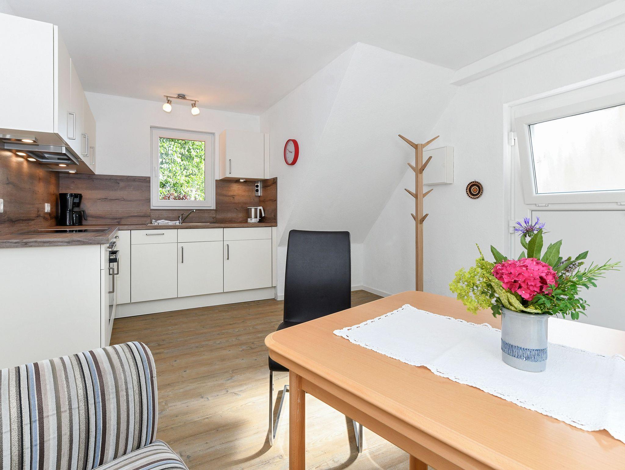 Größe ca. 32 Quadratmeter, Wohnraum mit integrierter Küche, Schlafzimmer, Badezimmer mit Dusche, Waschtisch und WC, Obergeschoss, optimal für 2 bis 3 Personen.