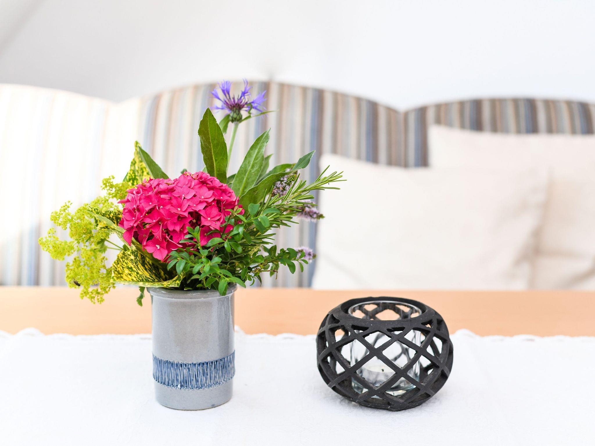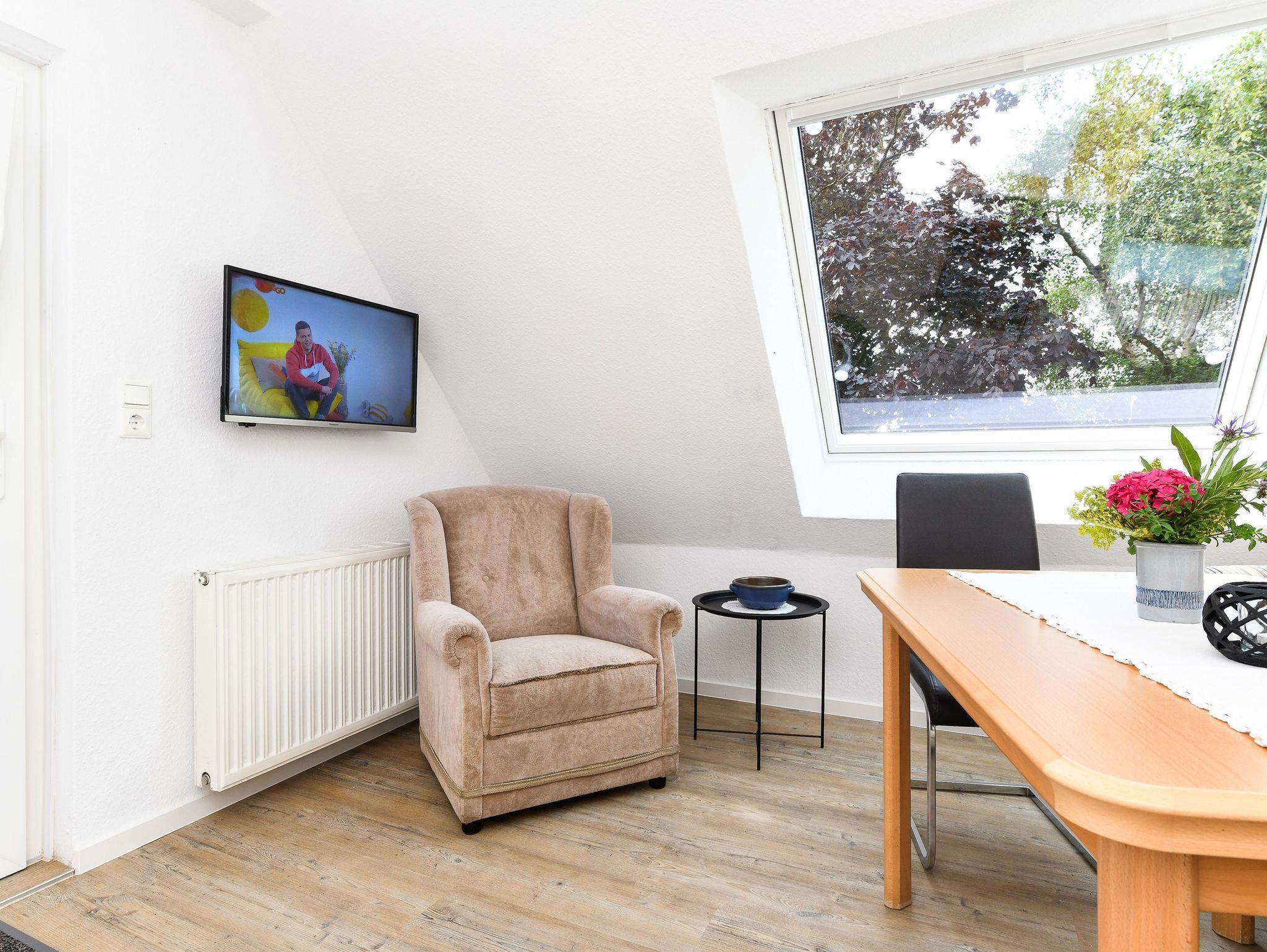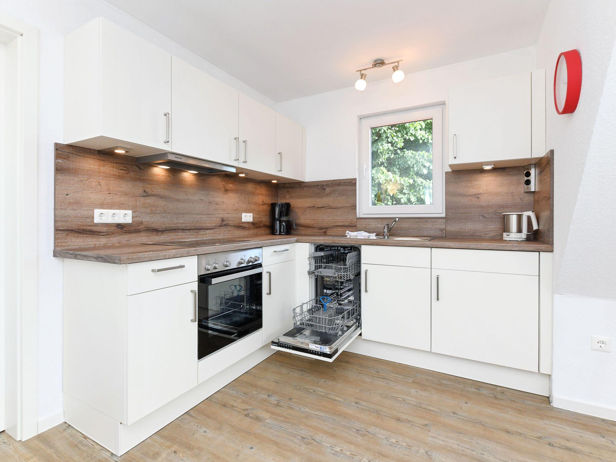 Größe ca. 32 Quadratmeter, Wohnraum mit integrierter Küche, Schlafzimmer, Badezimmer mit Dusche, Waschtisch und WC, Obergeschoss, optimal für 2 bis 3 Personen.