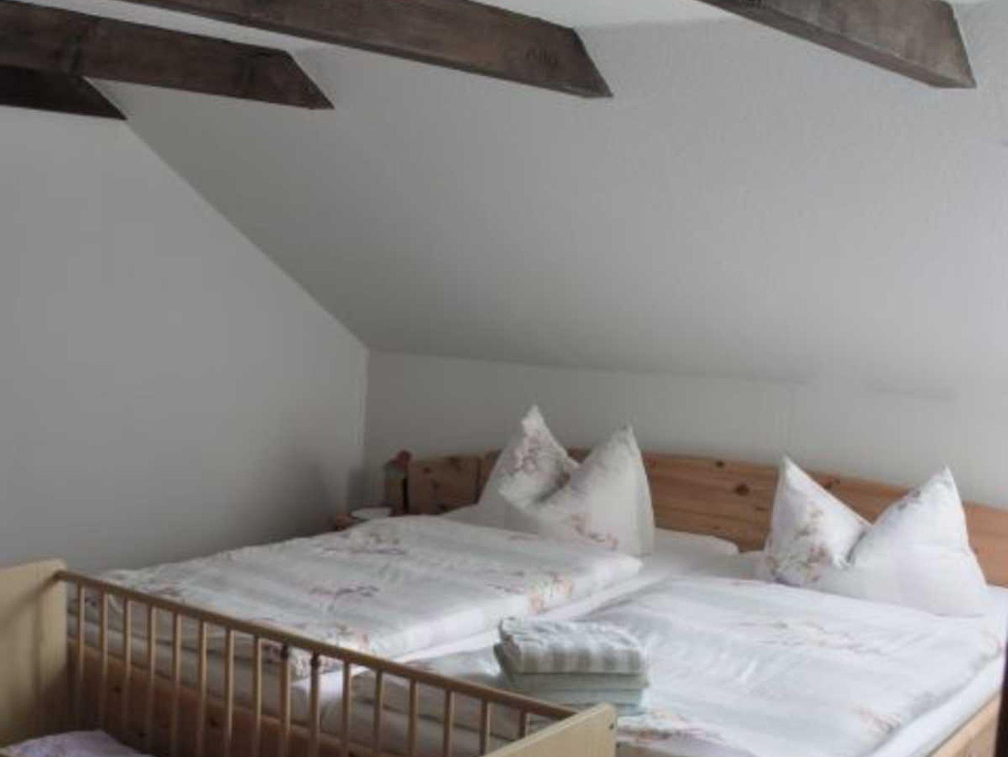 Im Obergeschoss des Hauses befindet sich die komplett eingerichtete Ferienwohnung (Nordwohnung) mit Wohnraum und Küchenzeile mit Geschirrspülmaschine und Backofen sowie das Badezimmer mit Dusche und WC. Im Dachgeschoss befindet sich ein Schlafzimmer mit Doppelbett und Kindergitterbett und ein Schlafzimmer mit Einzelbett und Etagenbett. Bettwäsche und Handtücher bitte mitbringen.