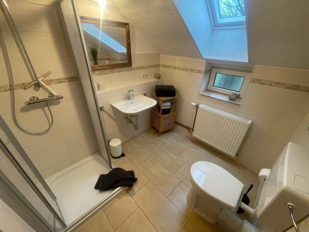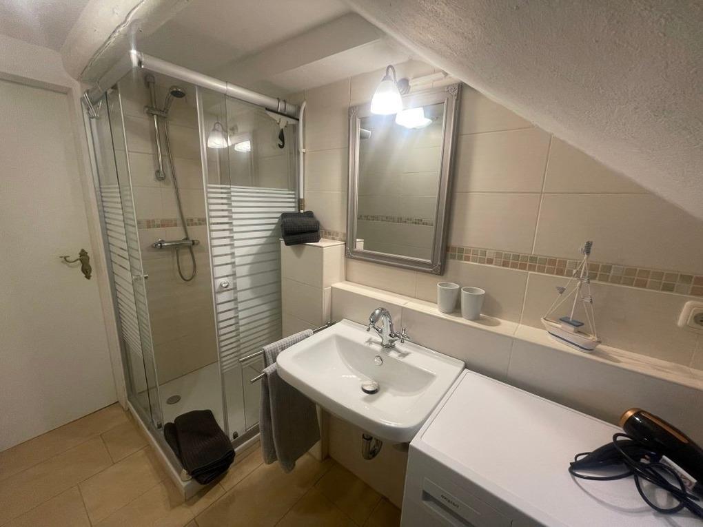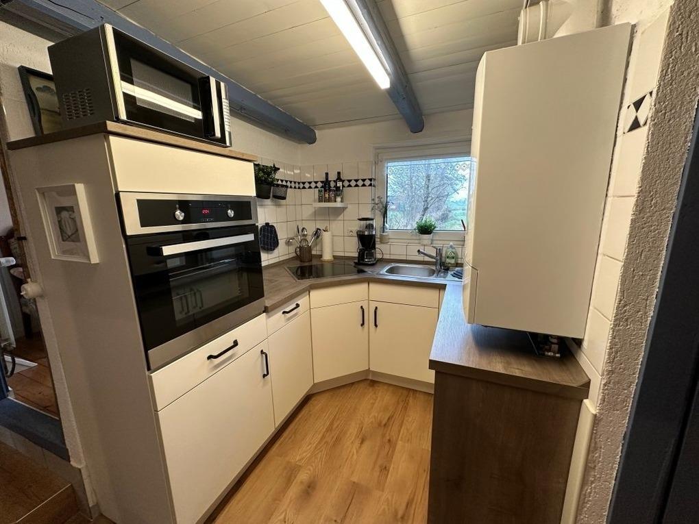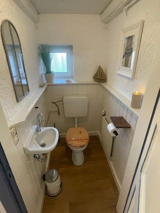 Die Küche ist als Durchgangsküche gebaut und modern und neu eingerichtet. Hier finden Sie neben einer Spülmaschine einen Backofen, Ceranfeld, Kühlschrank und Küchengeräte. Die beiden Badezimmer sind modernisiert und neu gefliest. Zusätzlich gibt es ein Gäste WC. Auch eine Waschmaschine steht im Landhaus.
