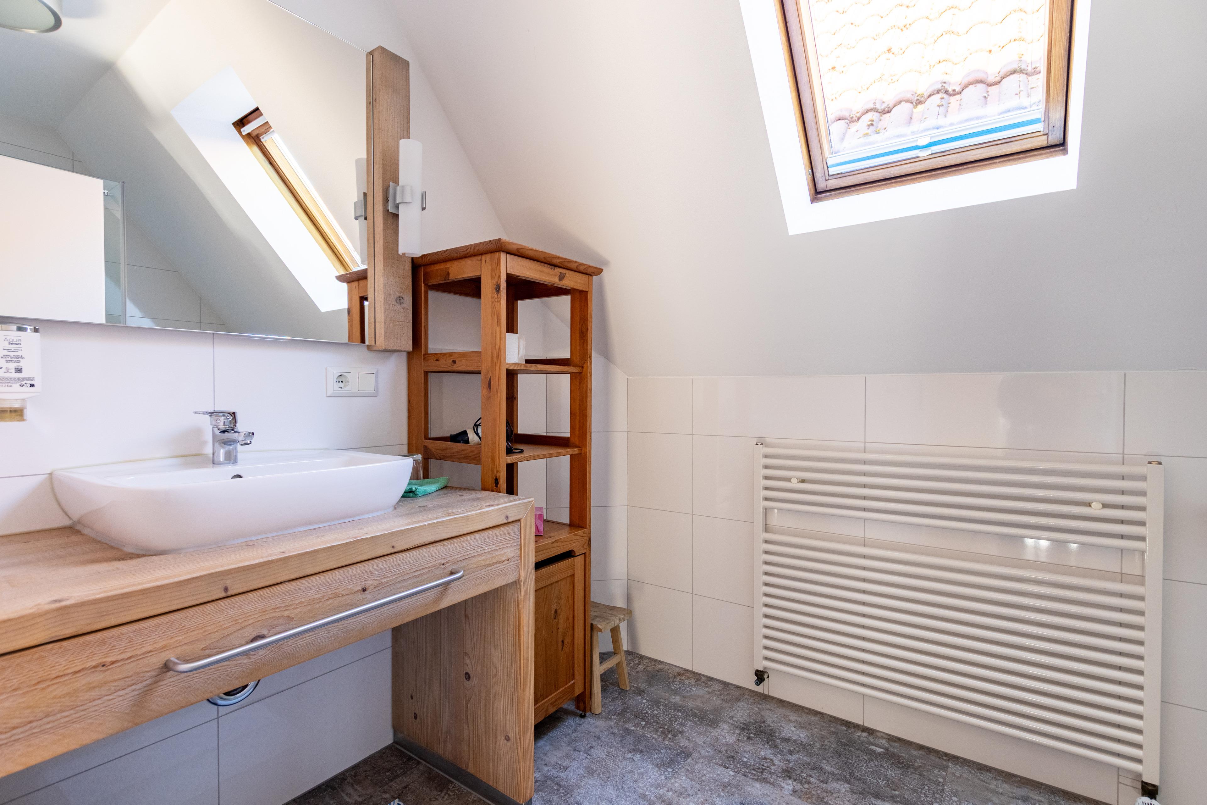 Das moderne Tageslichtbad ist mit Dusche, WC, großzügigem Waschtisch und Föhn ausgestattet.
