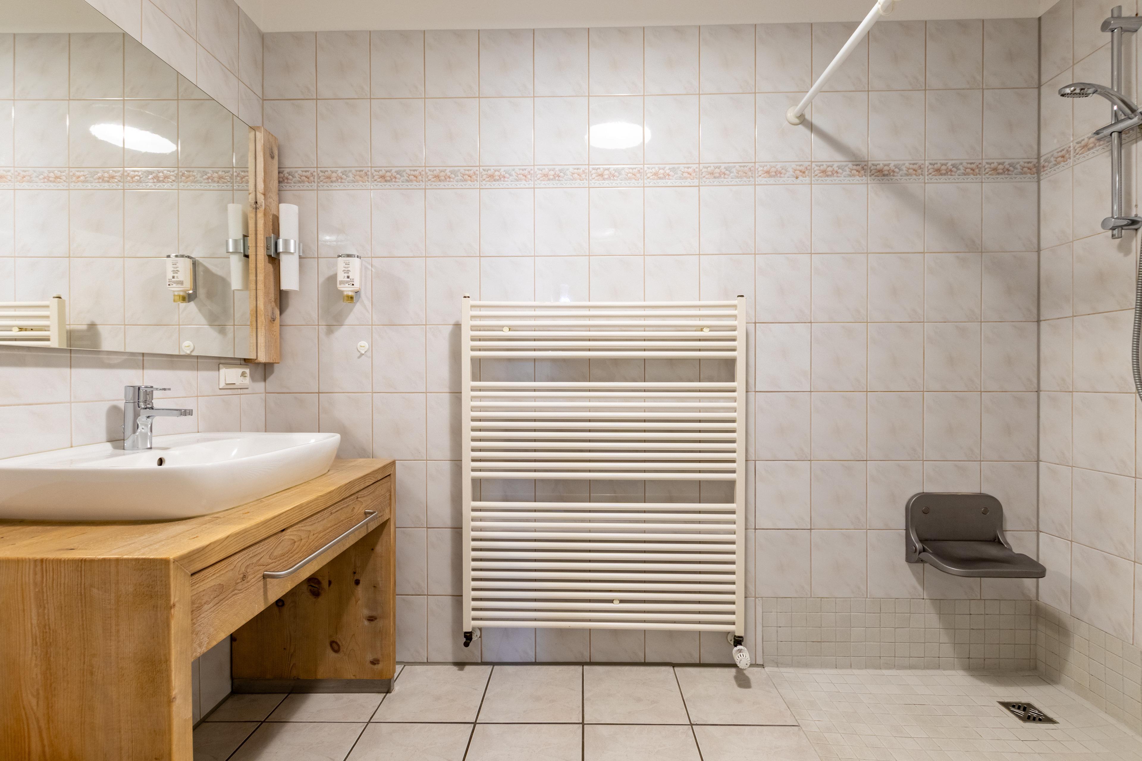 Das Bad verfügt über eine bodengleiche Dusche, WC, einen großzügigen Waschtisch sowie einen Föhn. Die barrierearme Gestaltung der Wohnung ermöglicht auch Gästen mit eingeschränkter Mobilität einen angenehmen Aufenthalt. Für zusätzlichen Stauraum steht ein praktischer Abstellbereich innerhalb der Wohnung zur Verfügung.