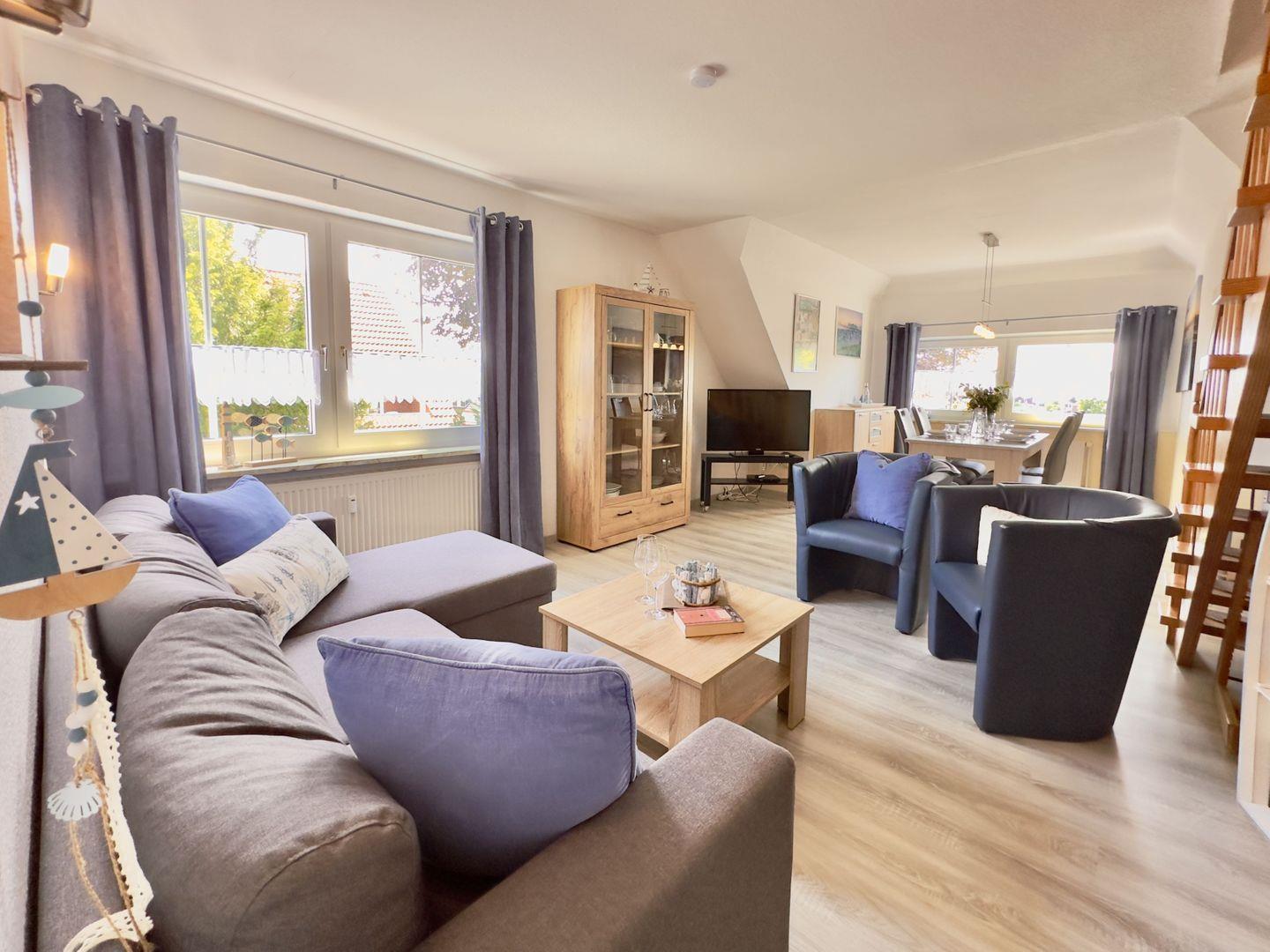 Unsere 53qm große Ferienwohnung in der zweiten Etage eines Mehrfamilienhauses lädt Sie ein, die besondere Atmosphäre der Nordseeküste zu erleben. Das offene Wohnzimmer mit Essecke ist lichtdurchflutet und strahlt Helligkeit und Freundlichkeit aus, perfekt für entspannte Stunden mit Ihren Liebsten. Die vielen Fenster sorgen für eine angenehme Sonneneinstrahlung und schaffen eine einladende Atmosphäre.
