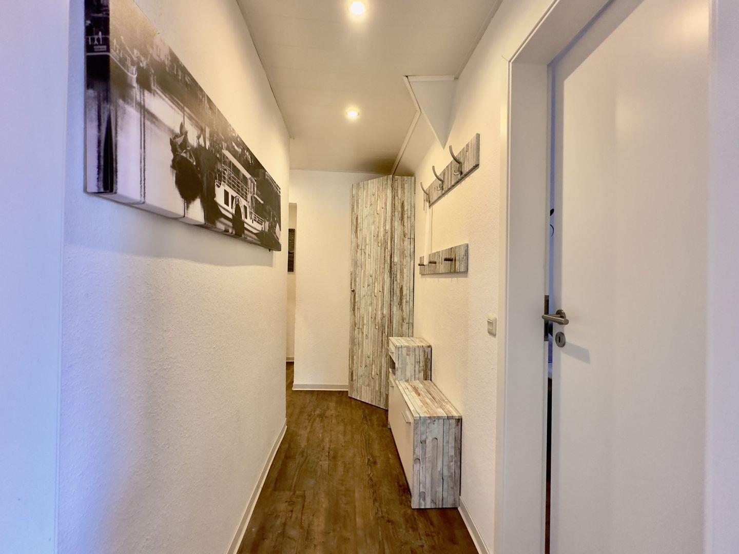 Das kleine Badezimmer im unteren Bereich der Wohnung ist freundlich und hell gefliest und bietet Ihnen alles, was Sie für Ihre tägliche Hygiene benötigen. Die angrenzende Küche ist komplett ausgestattet und lädt dazu ein, kulinarische Köstlichkeiten zuzubereiten.