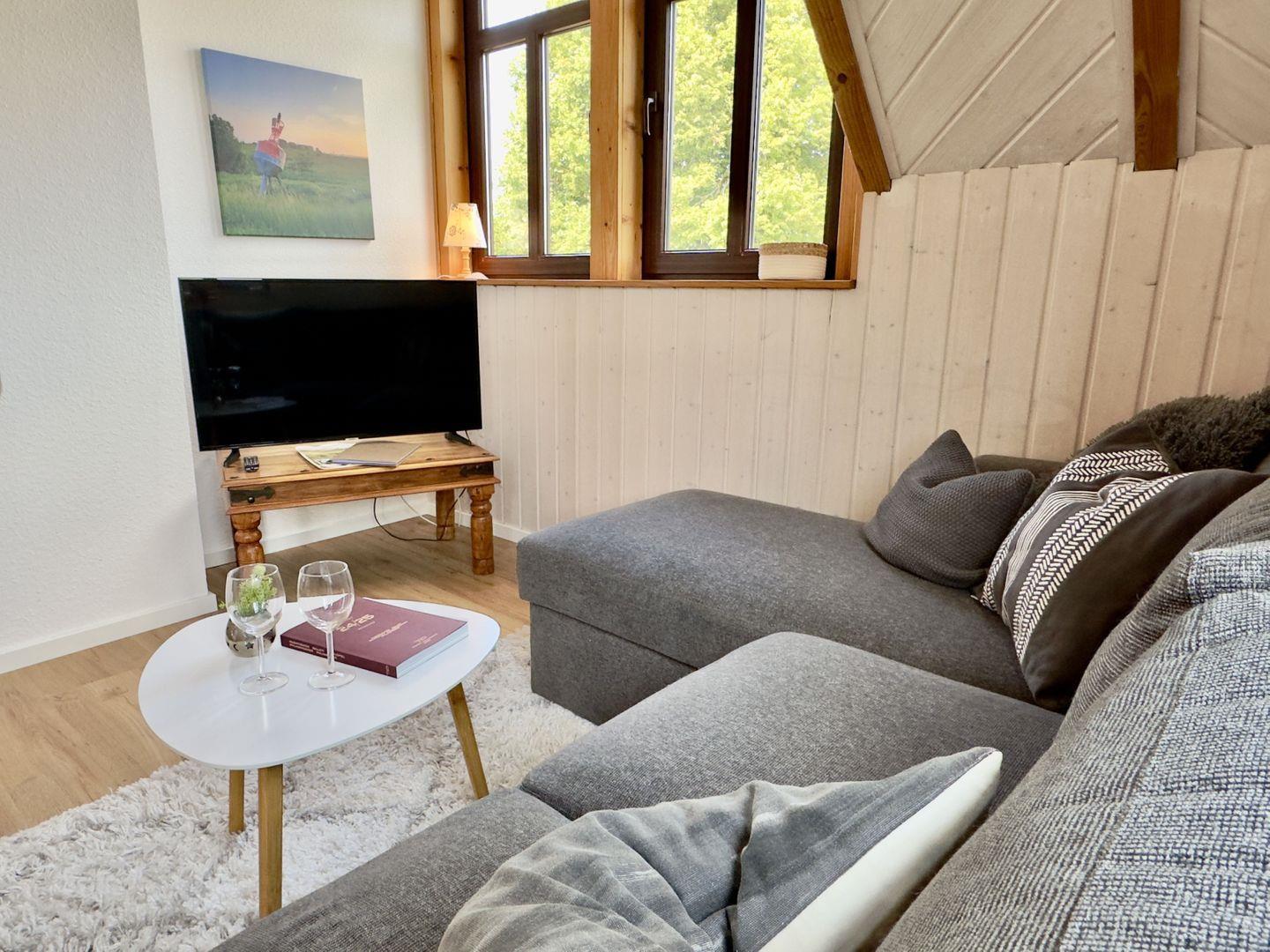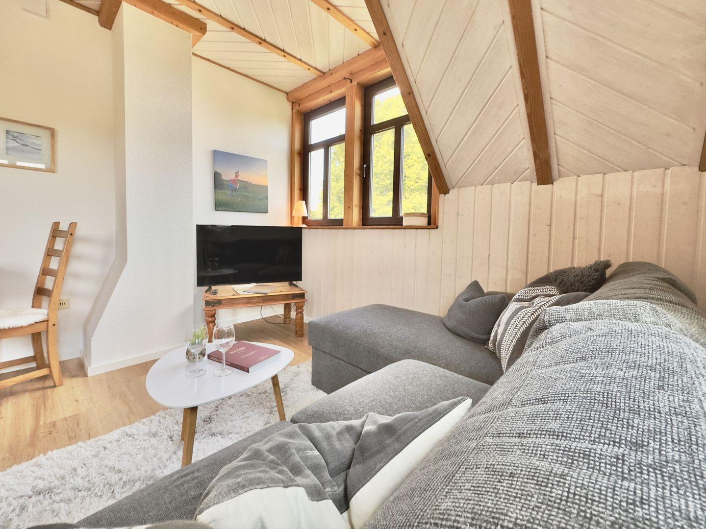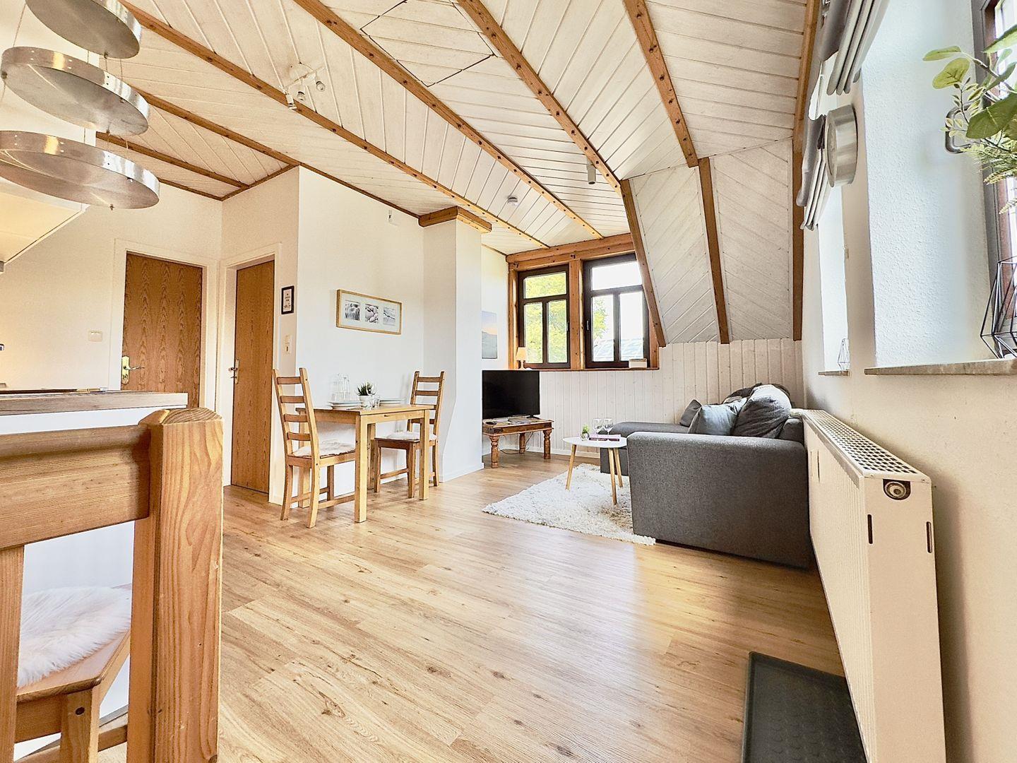 Der gemütliche Wohnbereich lädt mit einem bequemen Sofa und einer kleinen, charmanten Essecke zum Verweilen ein.