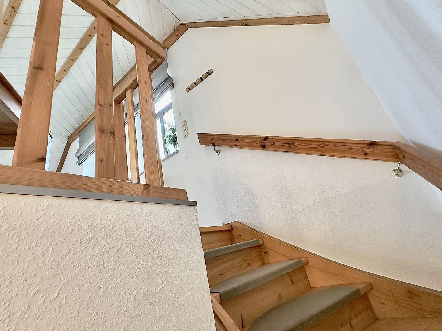 Natürliche Holzelemente und freiliegende Deckenbalken sorgen für ein behagliches, fast skandinavisch anmutendes Ambiente. Direkt neben dem Haus steht Ihnen ein eigener Parkplatz zur Verfügung – bequem und unkompliziert.