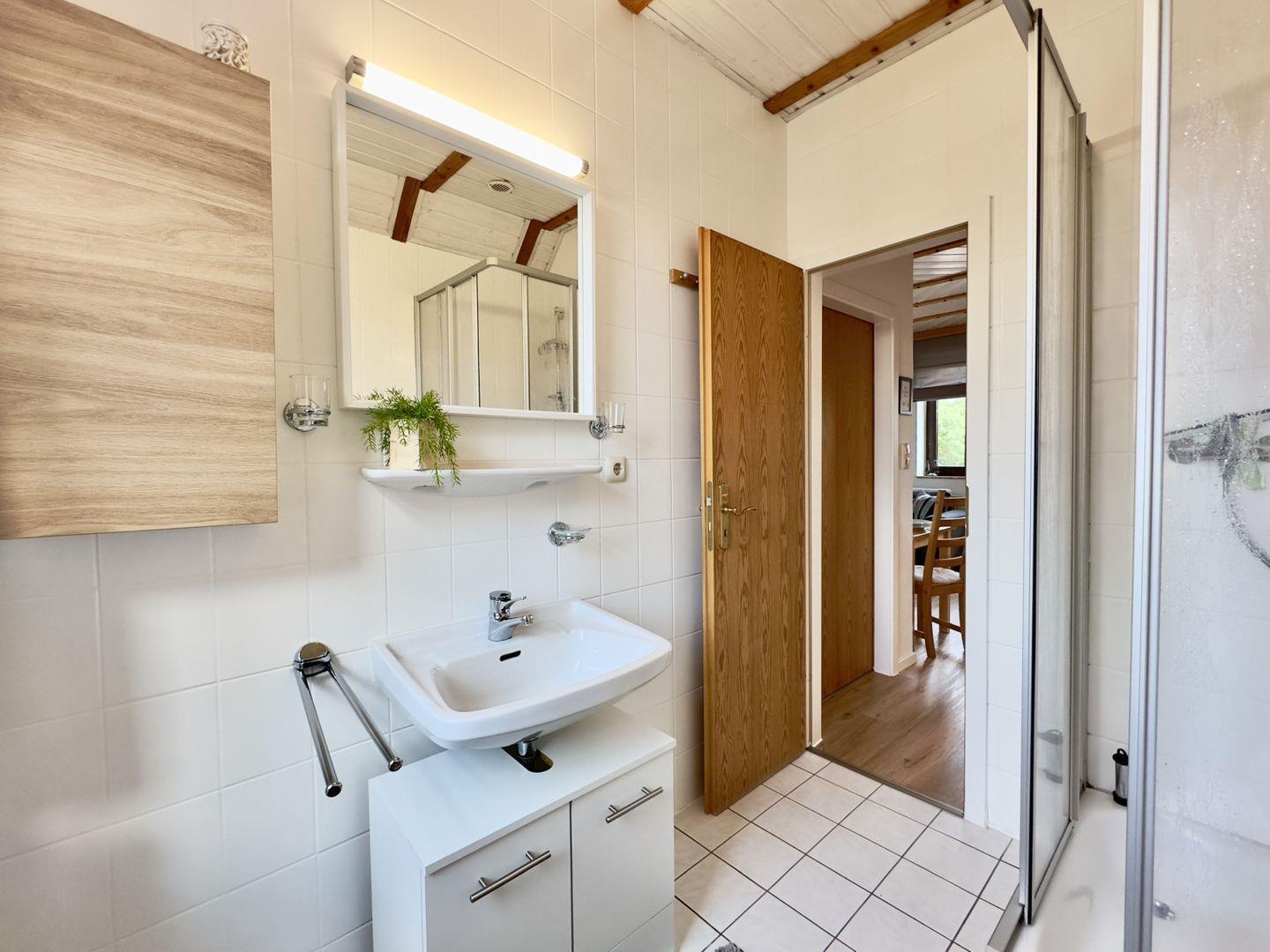 Das moderne Tageslichtbad mit geräumiger Dusche rundet das komfortable Gesamtbild ab.