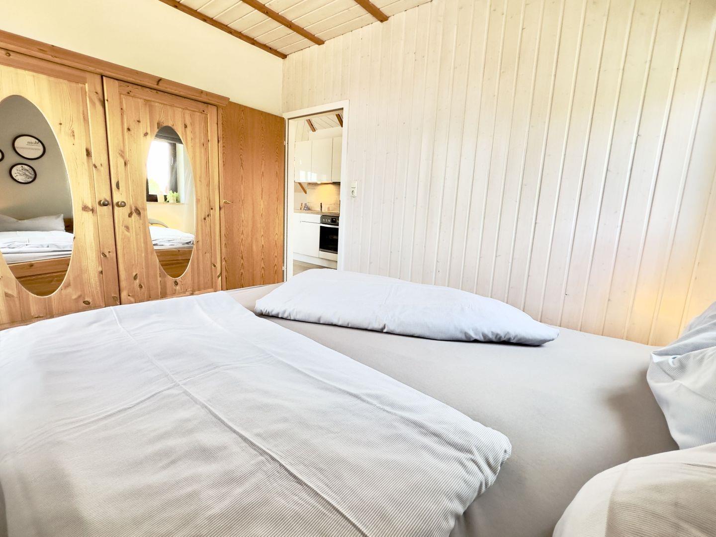 Im Schlafzimmer sorgt ein großes Doppelbett für erholsame Nächte, während der geräumige Kleiderschrank genug Platz für Ihre Urlaubsgarderobe bietet.