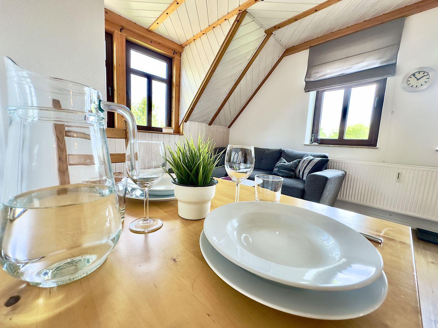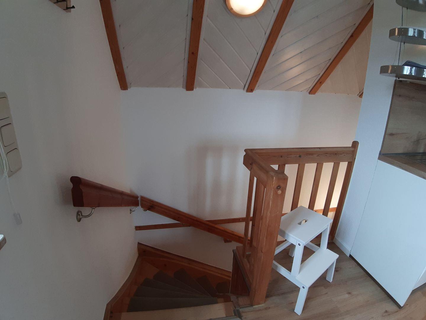 Über eine stabile Holztreppe erreichen Sie Ihr Feriendomizil im ersten Obergeschoss. Schon beim Eintreten empfängt Sie ein helles, offenes Wohnkonzept mit liebevollen Details und viel natürlichem Licht.