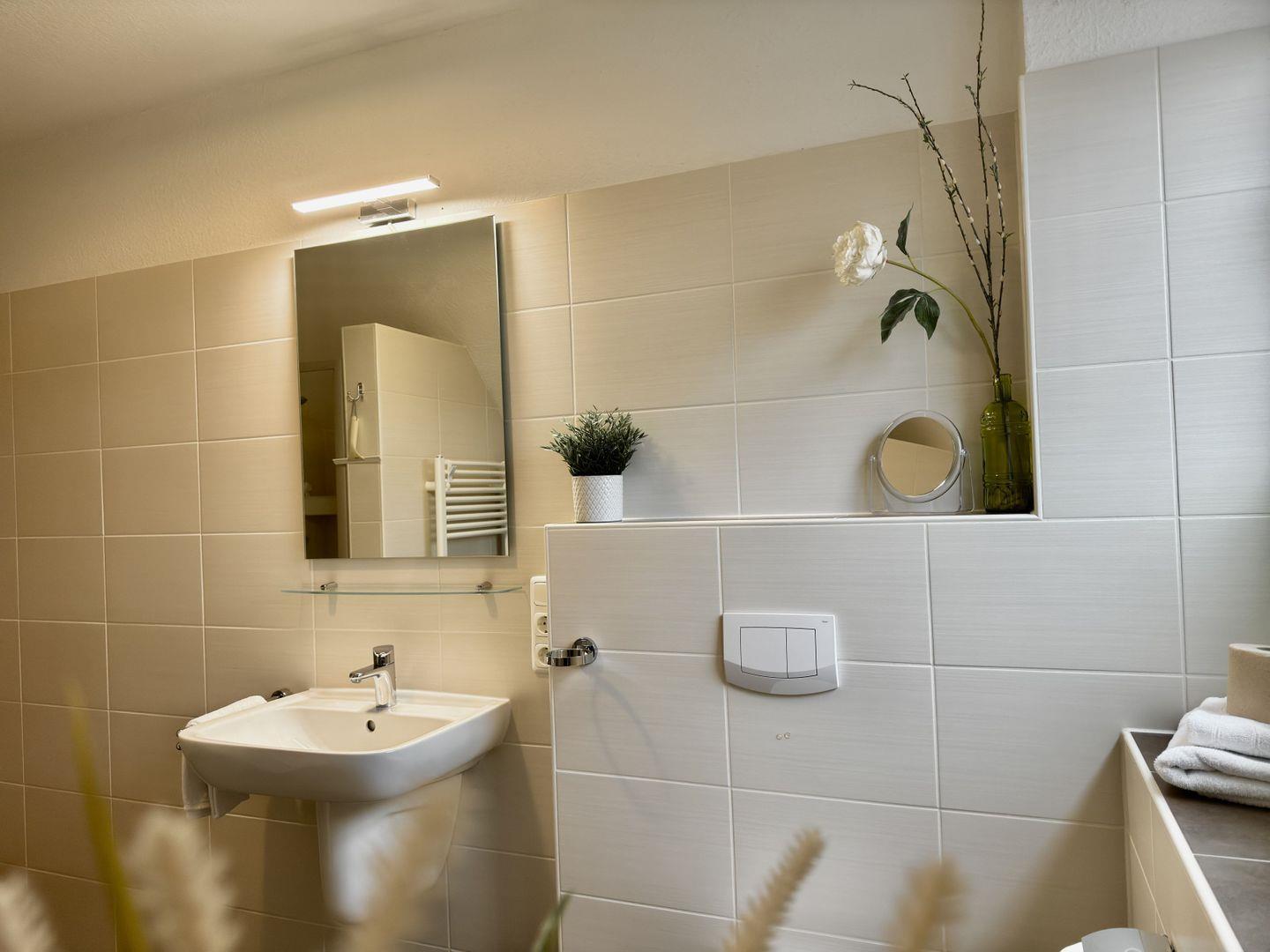 Das Tageslichtbad verfügt über eine geräumige Dusche sowie einen Wandspiegel und Kosmetikspiegel.