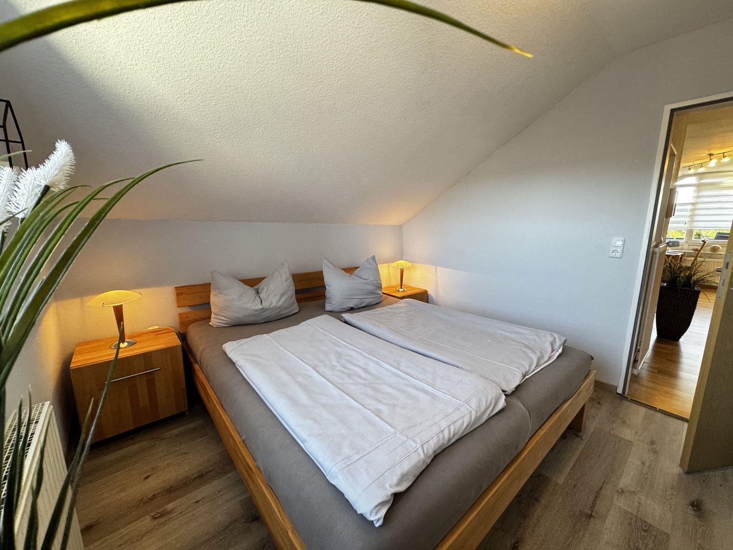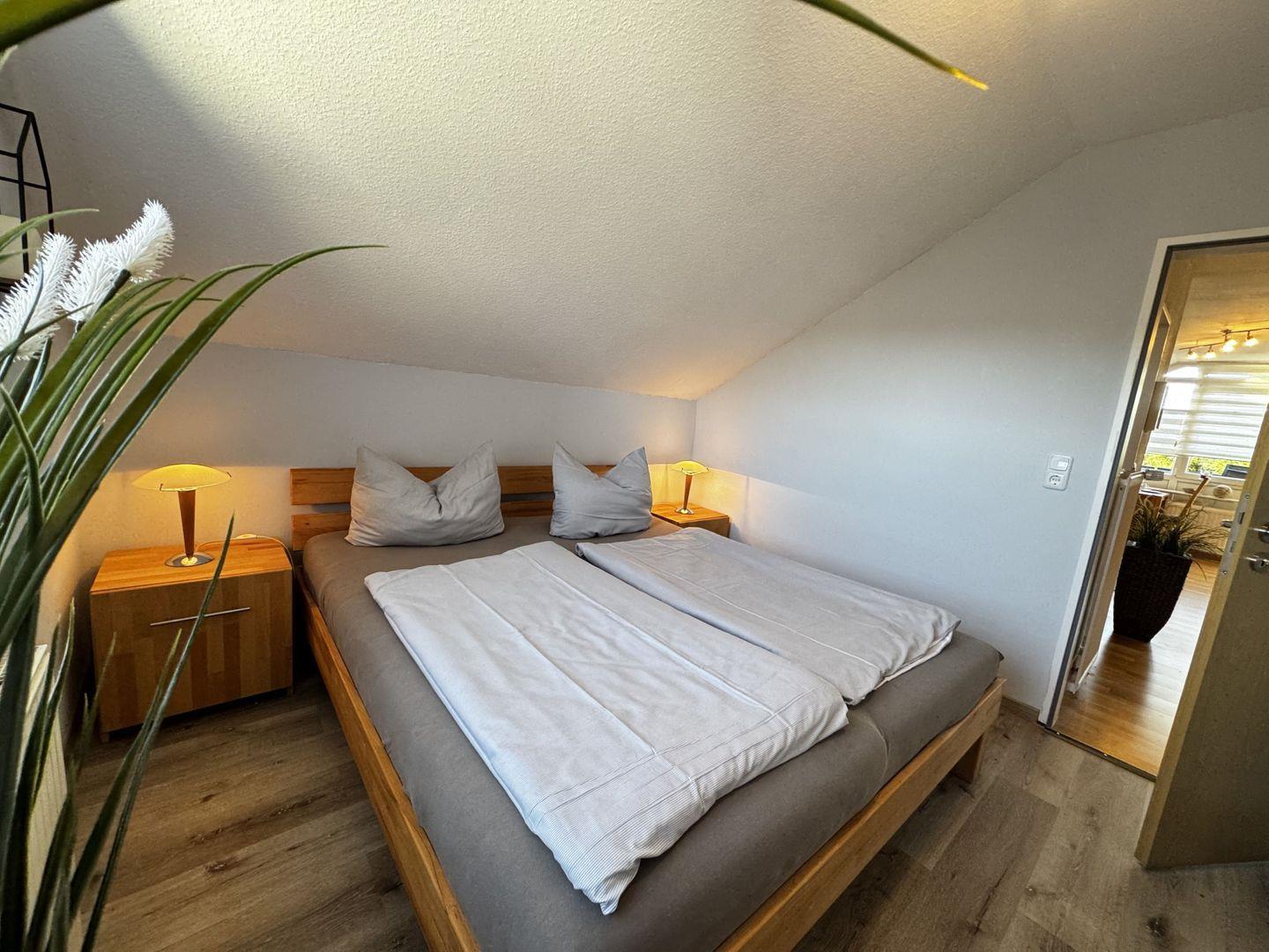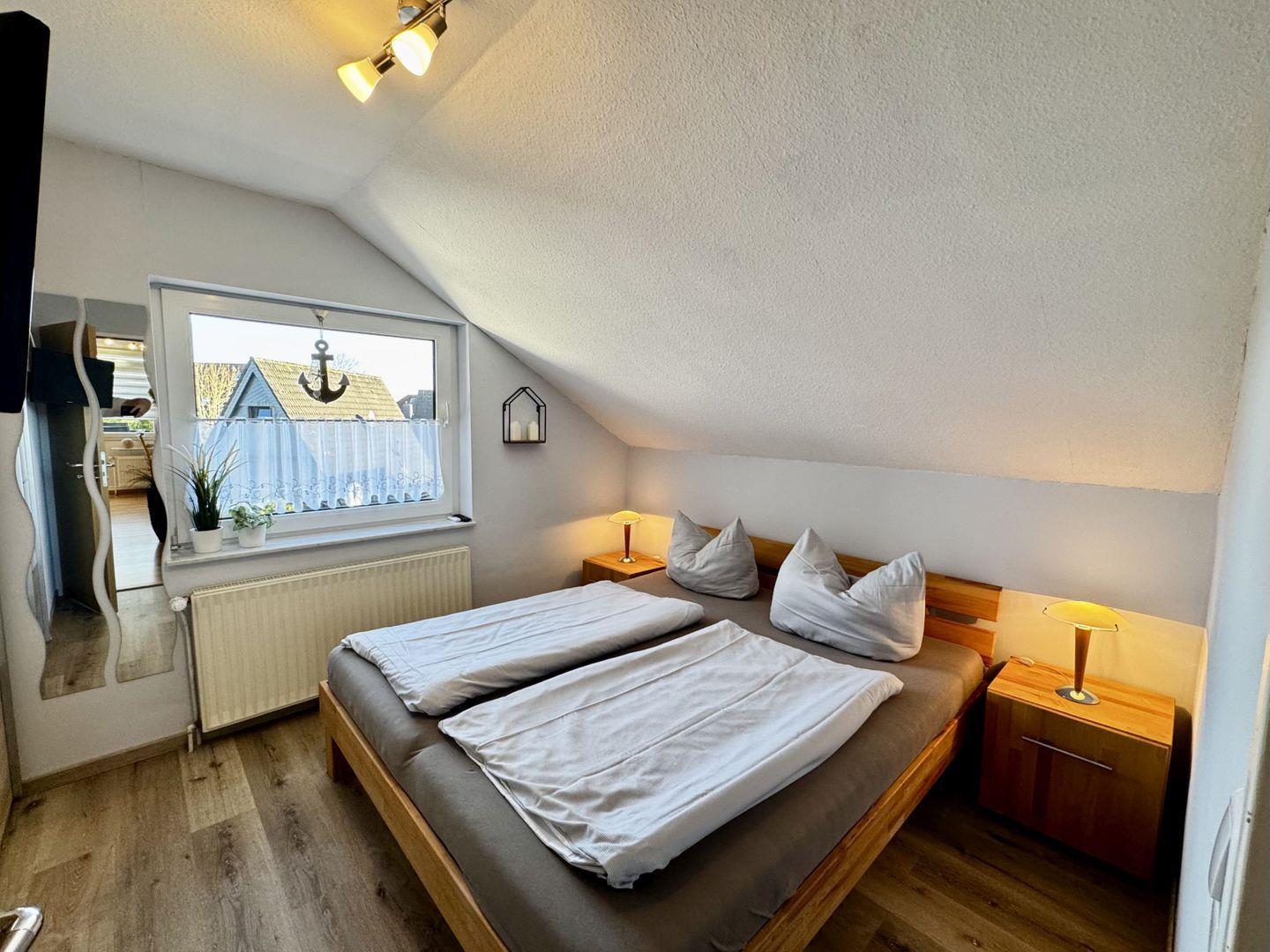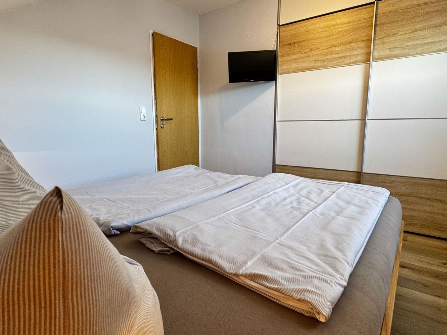 Im Schlafzimmer sorgen ein massives Doppelbett und warme Holztöne für erholsame Nächte. Ein großer Kleiderschrank bietet ausreichend Platz für Ihre Kleidung, während die Verdunklungsmöglichkeiten in allen Räumen eine ruhige Atmosphäre schaffen.