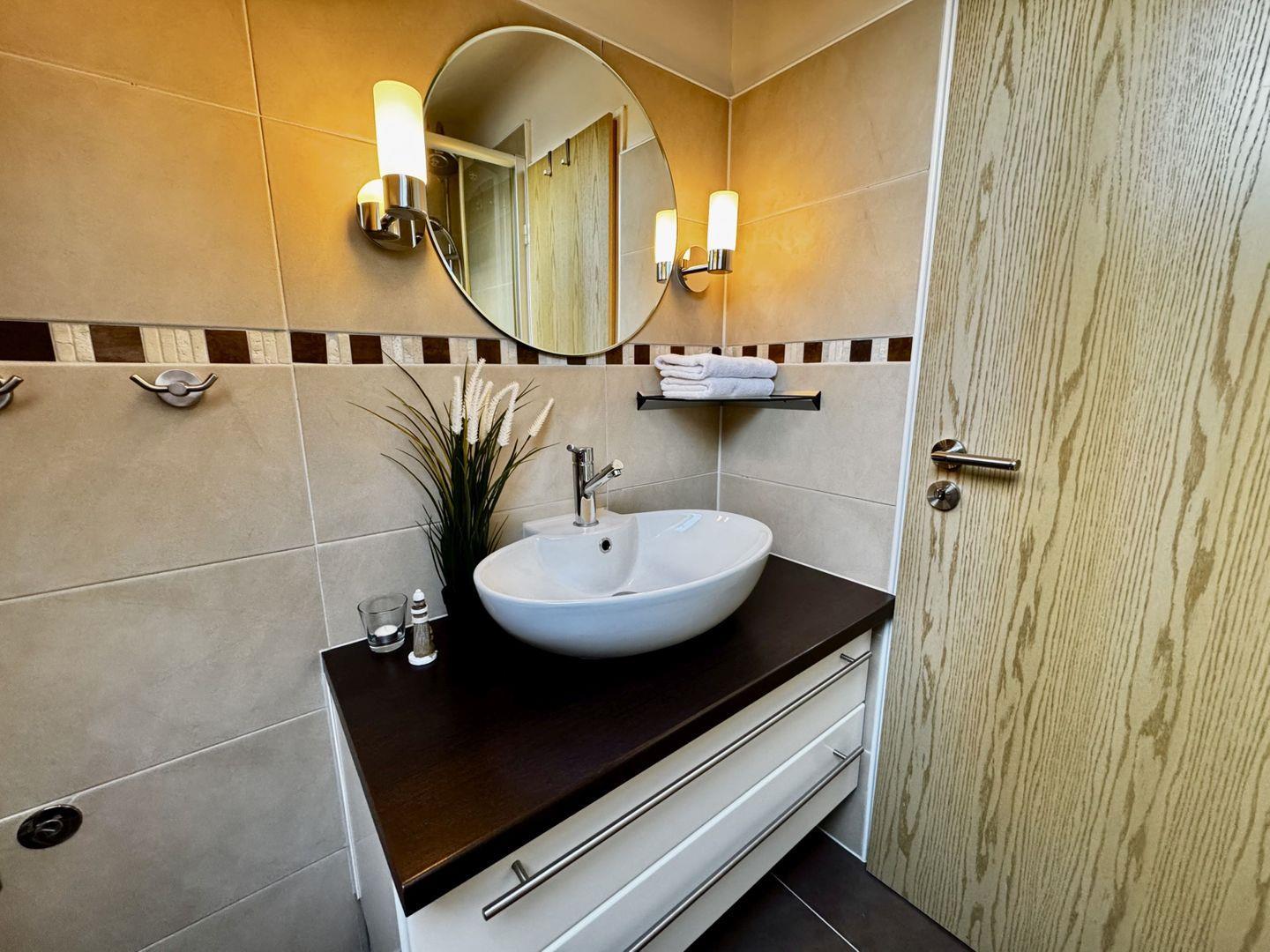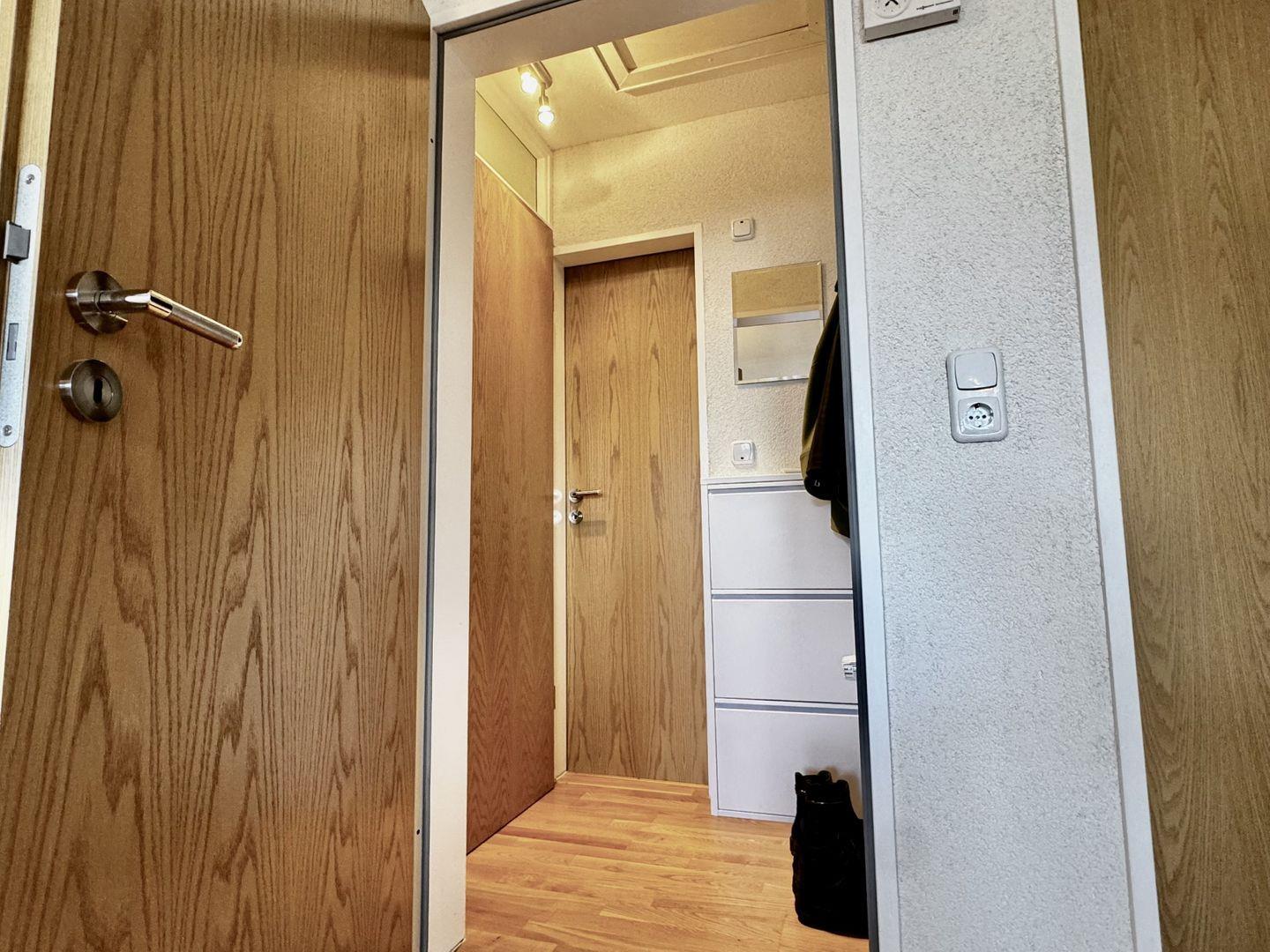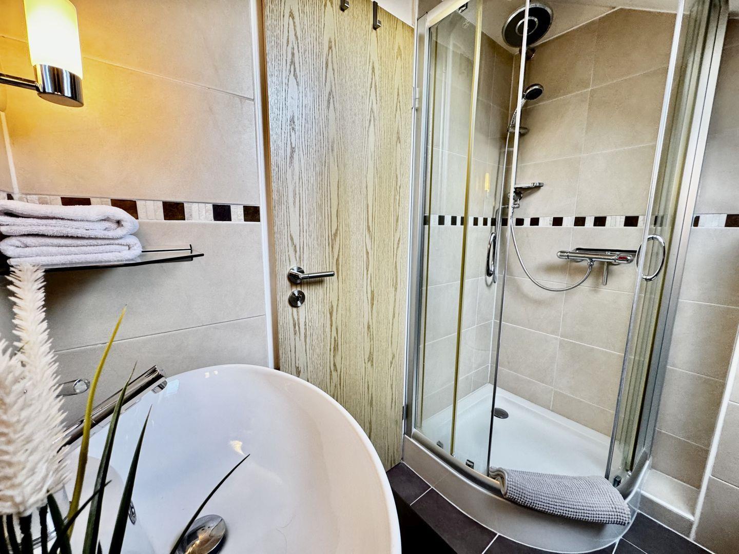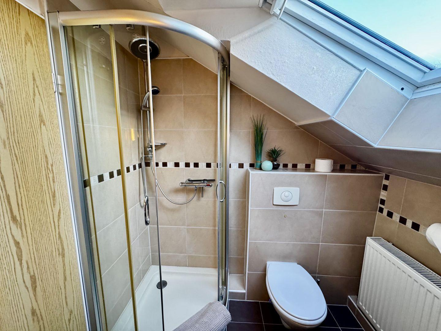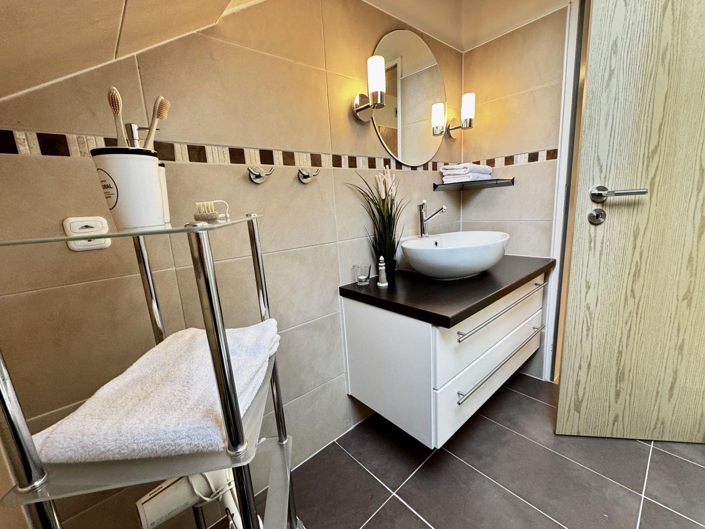 Das in Erdtönen gestaltete Tageslichtbad mit großem Dachfenster verspricht einen perfekten Start in den Tag. Mit einer Garderobe und einem Ganzkörperspiegel ist auch der Flur bestens ausgestattet.