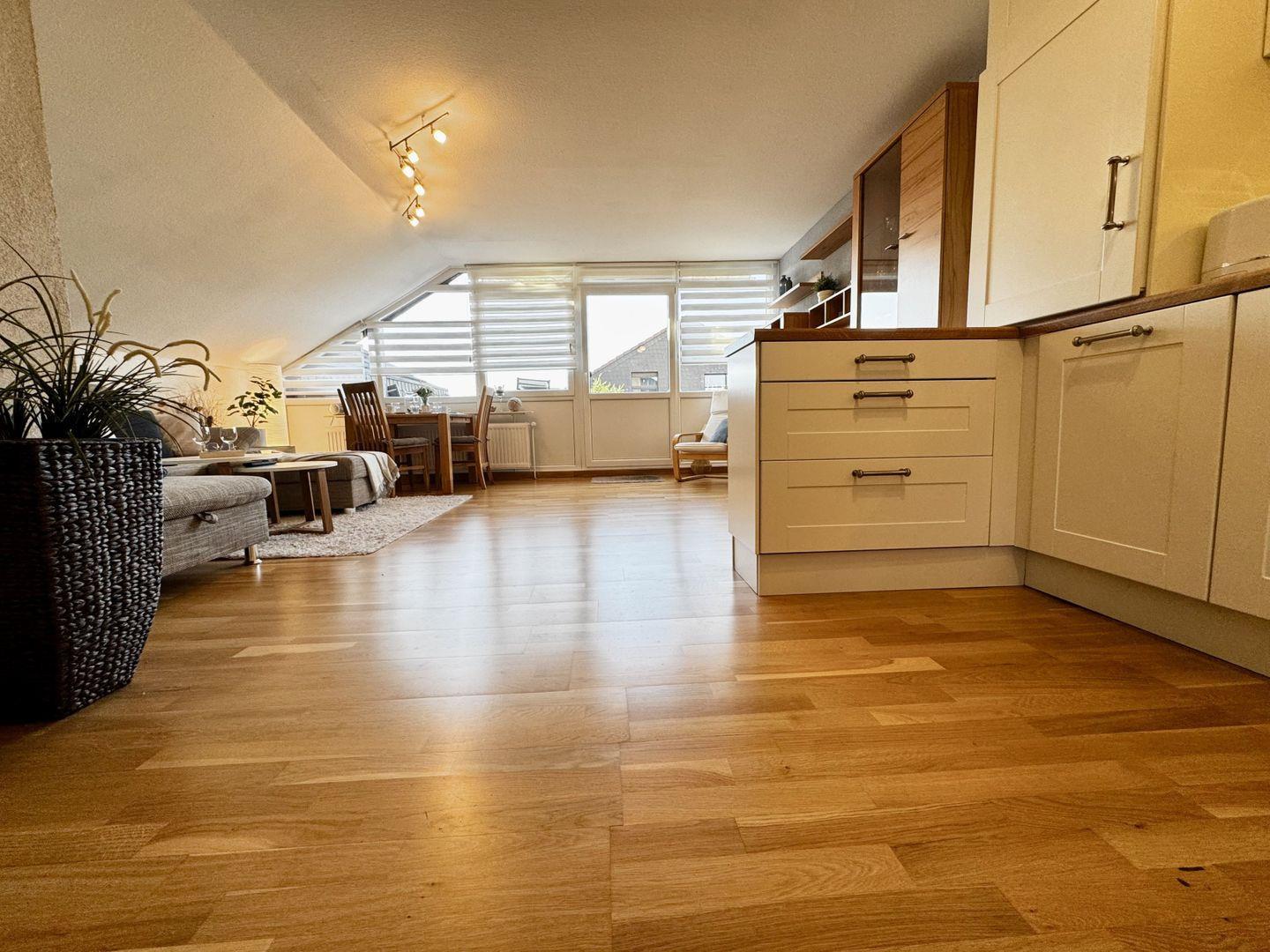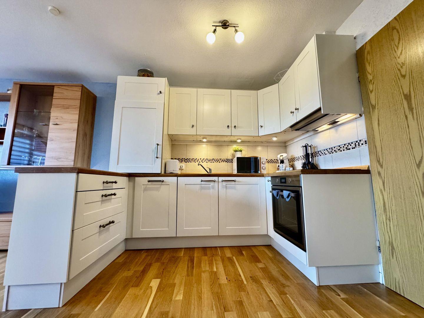 Das moderne, helle Wohnzimmer lädt mit hochwertigen Möbeln und schönem Parkettboden zum Verweilen ein. Die offene Wohnküche, ausgestattet mit allem, was das Kochherz begehrt, sorgt dafür, dass Sie auch beim Kochen mit Ihren Liebsten verbunden bleiben. Ob auf dem stabilen Schlafsofa zum Entspannen oder am großen Esstisch für einen Spieleabend – hier können Sie schöne gemeinsame Momente erleben.