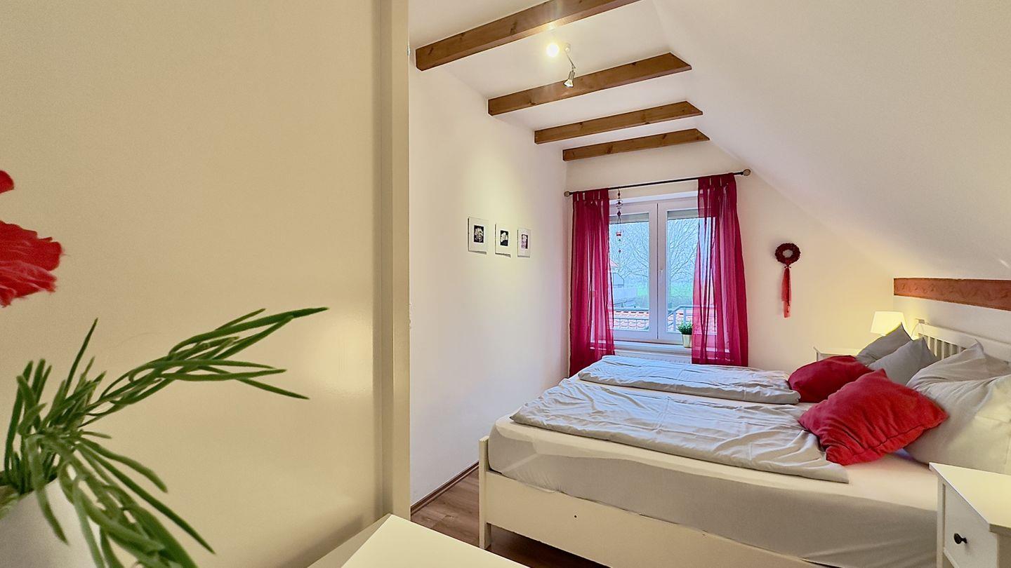 Das Schlafzimmer, ausgelegt mit Venyl strahlt eine behagliche Atmosphäre aus, ergänzt durch die hellen Holzmöbel. Ein Doppelbett und ein großer Kleiderschrank stehen zur Verfügung, um den Aufenthalt angenehm zu gestalten. Das zweite Schlafzimmer verfügt über zwei Einzelbetten mit Nachtschränken und einem Hängeschrank für die Kleidungsaufbewahrung.
