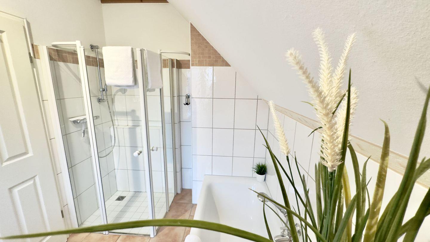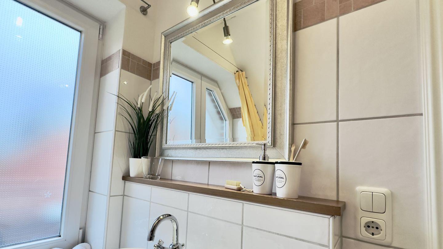 Das hell geflieste Badezimmer bietet mit Badewanne, Dusche und einem Fenster viel Komfort und Raum. Ein großer Wandspiegel vervollständigt die Ausstattung dieses Badezimmers.
