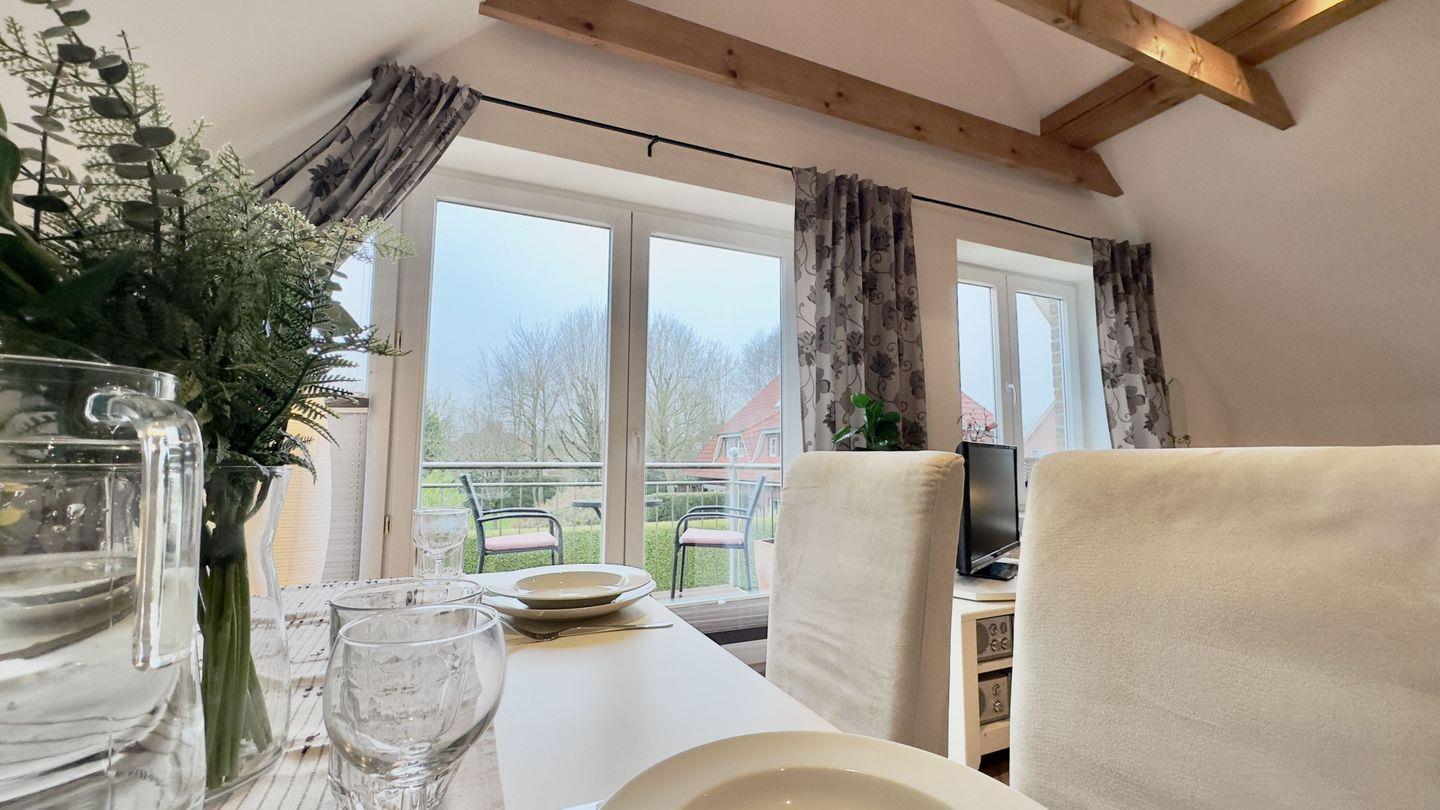 Die offene Wohnküche ist direkt mit dem Esszimmer im Wohnbereich verbunden und bietet alles, was man für die Selbstverpflegung im Urlaub benötigt. Der geräumige Esstisch bietet einen herrlichen Blick auf den Balkon und ausreichend Platz für gesellige Mahlzeiten sowie Spieleabende.