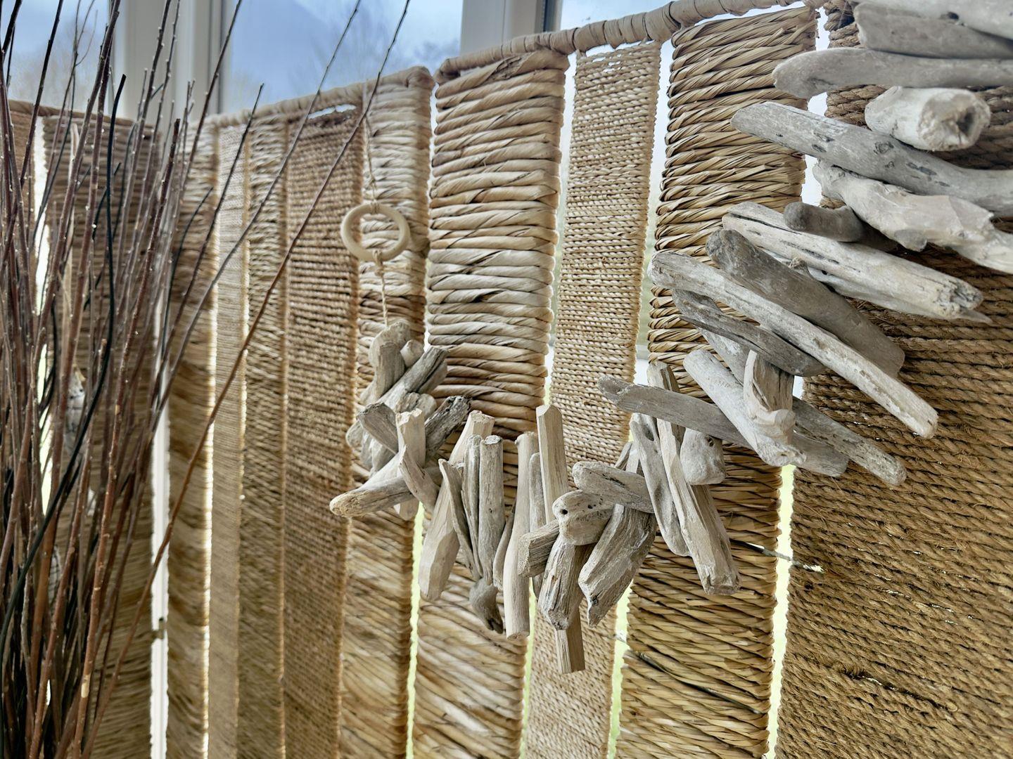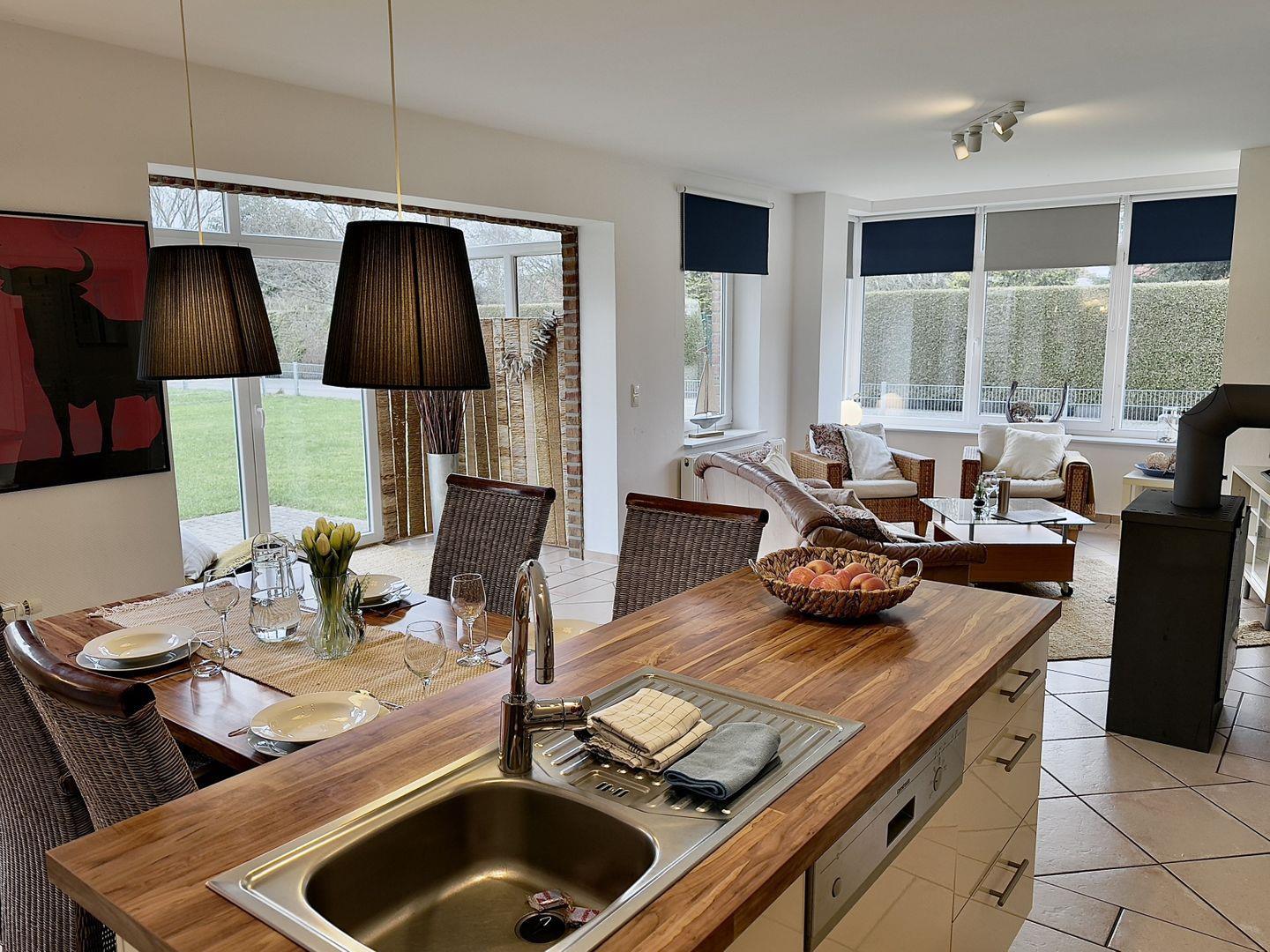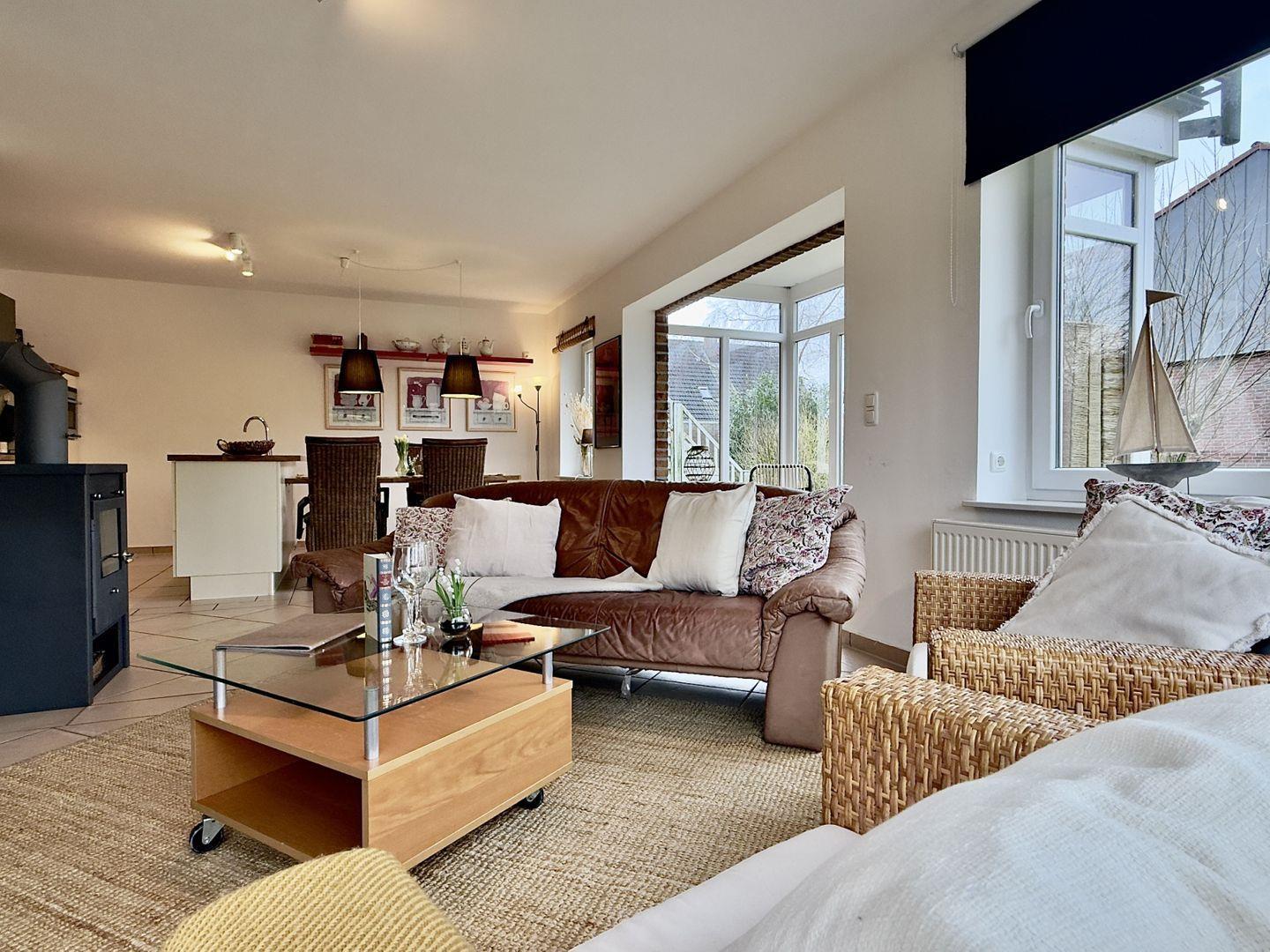 Das gemütliche Sofa in warmen Erdtönen und die beiden Rattansessel laden zum Entspannen ein. Genießen Sie gemütliche Abende vor dem Fernseher oder lassen Sie sich vom knisternden Kamin verzaubern, der an stürmischen Tagen für eine behagliche Wohlfühloase sorgt. Die angrenzende Essgruppe bildet das Herzstück des Raumes – hier finden Sie ausreichend Platz für gemeinsame Mahlzeiten oder gesellige Spieleabende mit Ihren Liebsten.