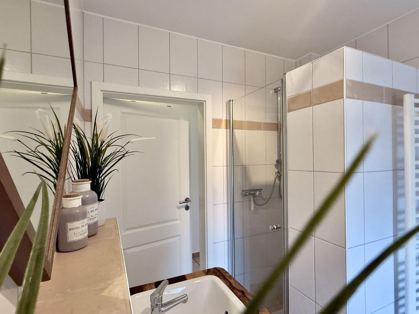 Das helle Badezimmer in harmonischen Erdtönen sorgt für den perfekten Start in den Tag oder entspannte Abendstunden. Eine Badewanne lädt an kühlen Tagen zu einem wohltuenden Bad ein, während die Dusche an warmen Sommertagen für eine erfrischende Abkühlung sorgt. Dank der zwei Waschbecken können Sie hier problemlos gemeinsam den Tag beginnen.