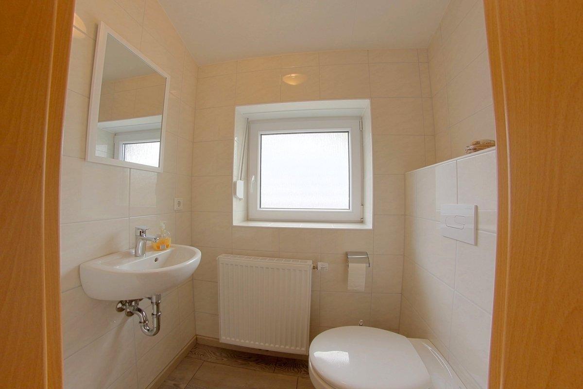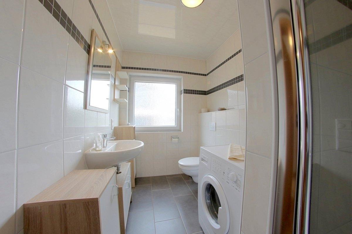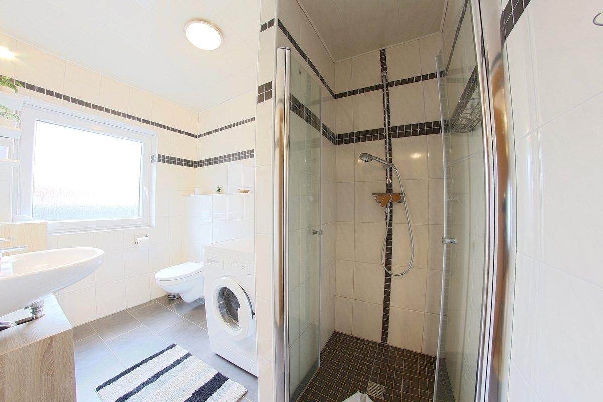 Im Erdgeschoss befindet sich das helle Duschbad mit bodengleicher Dusche und Waschmaschine, im Obergeschoss ein weiteres WC.