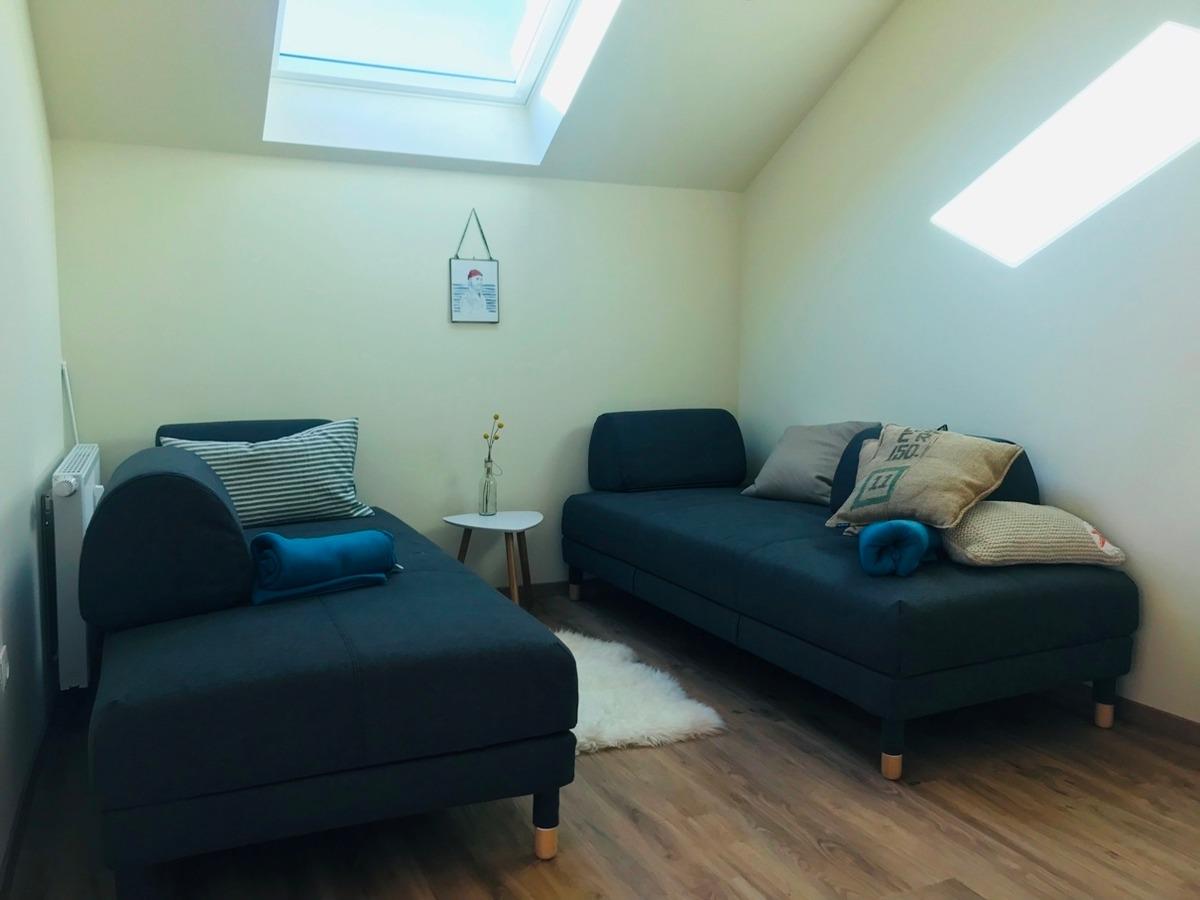 Im abgeteilten Wohnbereich stehen zwei Schlafcouchen zur Verfügung, die flexibel stellbar sind.
