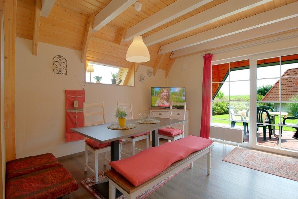 E:G: Wohnzimmer mit Essecke, Eckcouch, DVD-Player, Flachbild-TV, Stereoanlage/CD/Bluetooth/USB, Spielen, Büchern, Gästeinformationen, Schreibtisch, Glasfaseranschluß, Telefon, WLAN und LAN, Elektrokamin mit Flammenspiel, Rolladen an der Terrassentür