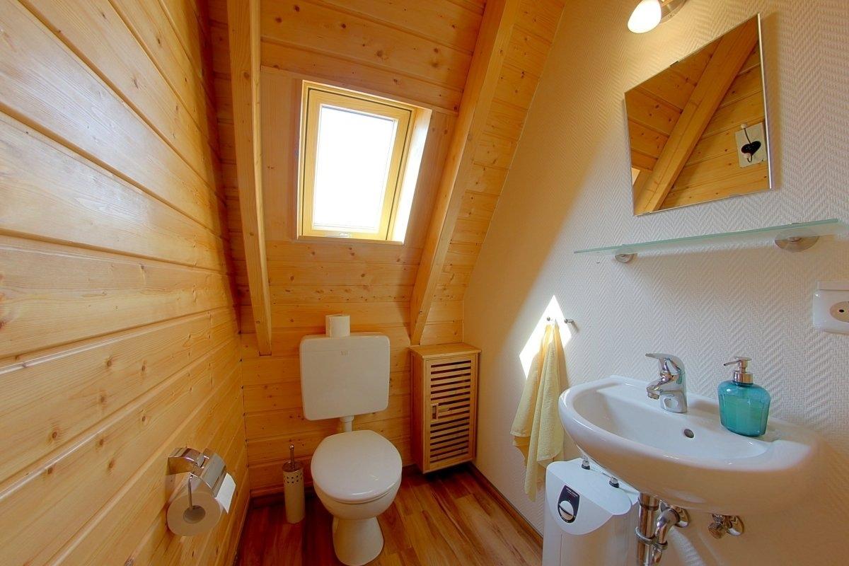 Gästetoilette mit Fenster, WC, Waschbecken, Warmwasser, Ablagen
