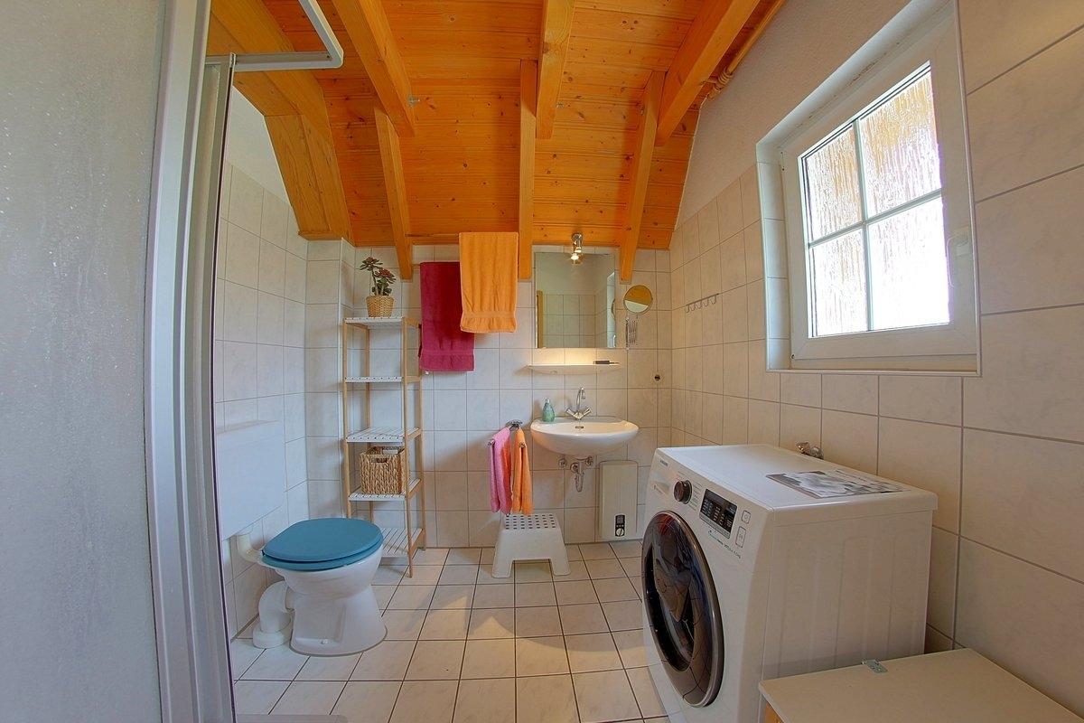 Ein helles Duschbad mit Fenster und Waschmaschine steht Ihnen ebenfalls im Erdgeschoss zur Verfügung.