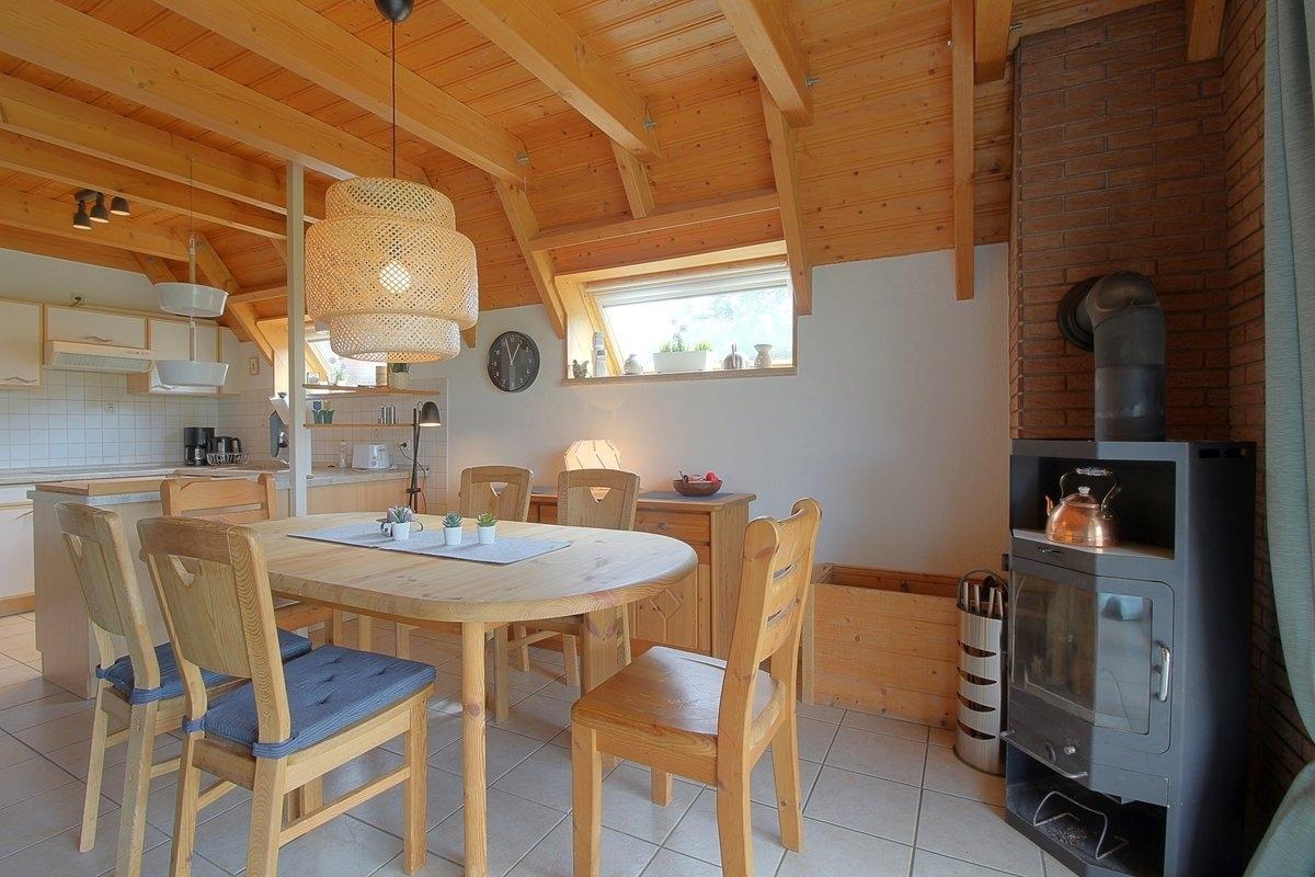 Im offen gestalteten, komplett gefliesten Erdgeschoss, gibt es einen Wohn- und Essbereich mit Kaminofen für die kältere Jahreszeit. Küche mit komplett ausgestatteter Einbauküche. Vom Wohnraum aus geht es direkt auf die Terrasse. Ab sosfort auch kostenloses W-Lan verfügbar