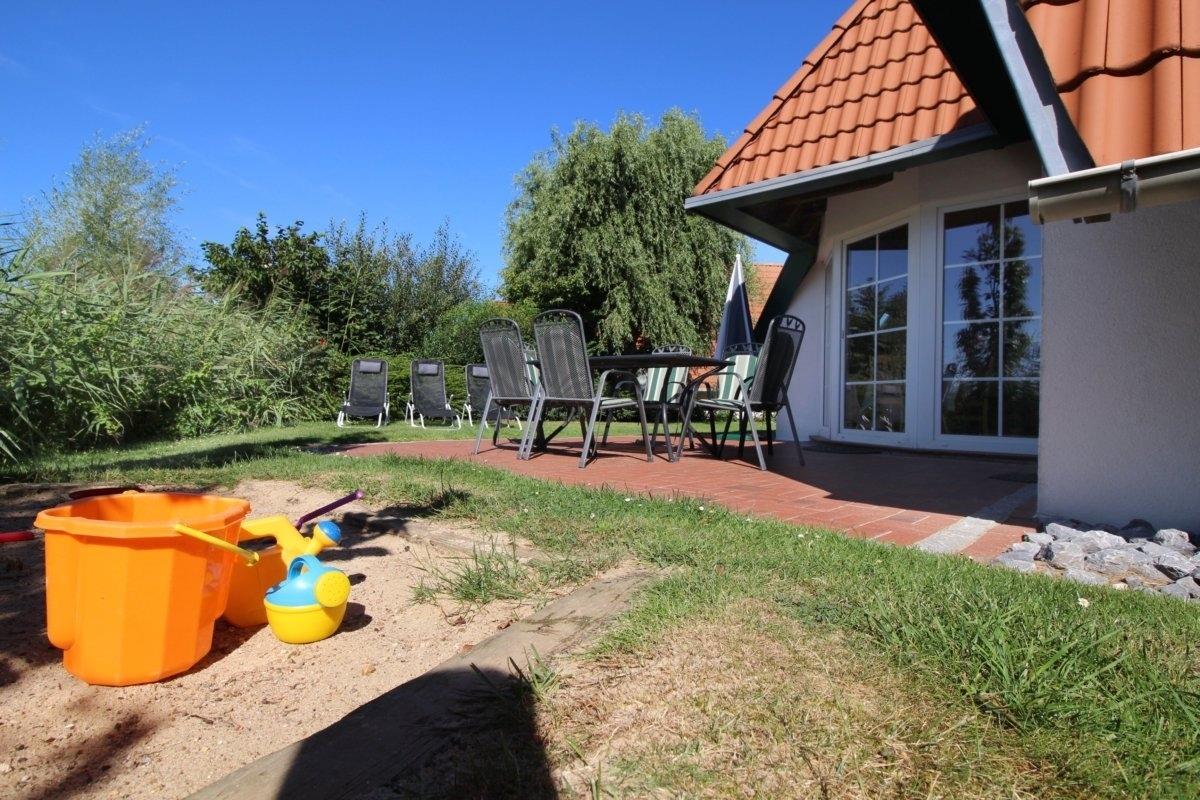 Auf der Terrasse mit Gartenmöbeln, Sonnenliegen und sogar einem Sankasten können Sie den freien Blick auf den Deich genießen