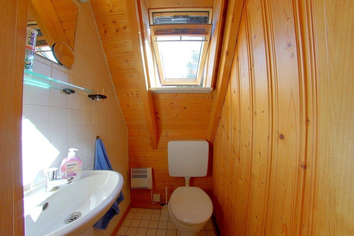 Ein Duschbad mit WC und Waschmaschine im Erdgeschoss und ein weiteres WC im Obergeschoss.