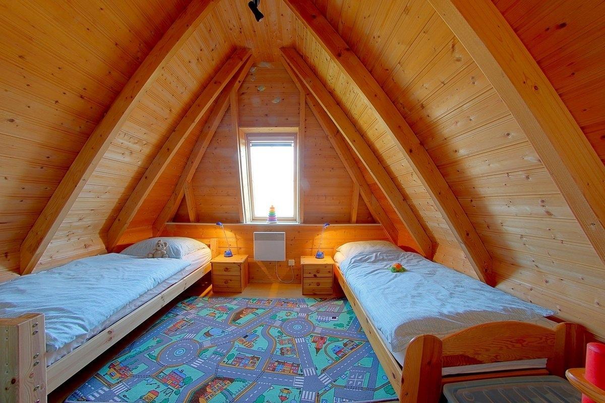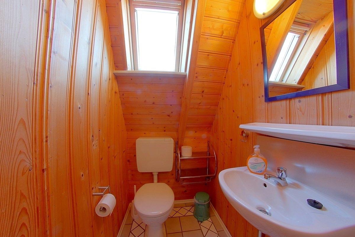 Im Obergeschoss befinden sich zwei weitere Schlafzimmer und ein WC mit Waschbecken. Ein Schlafzimmer mit Doppelbett, und Babybett für ein Kleinkind und ein weiteres Schlafzimmer mit 2 Einzelbetten. Ein Babyreisebett steht außerdem noch zur Verfügung. Rollos zur Verdunkelung gehören zum Komfort.