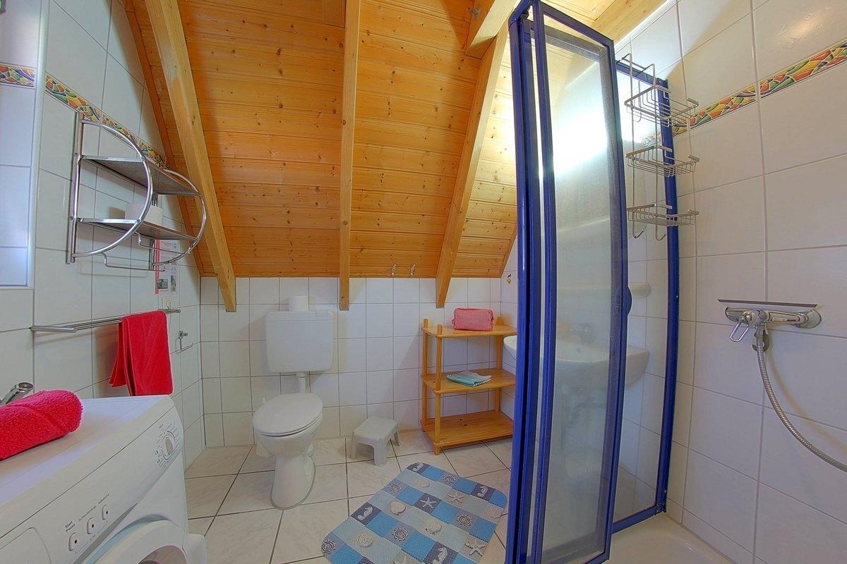 Im Erdgeschoß befindet sich ein Schlafzimmer mit zwei Einzelbetten, sowie ein helles, modernes Duschbad mit Waschmaschine. Alle Schlafzimmer mit Laminatböden.