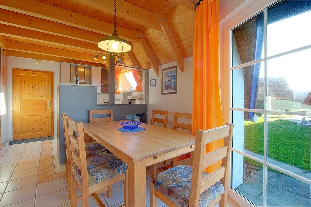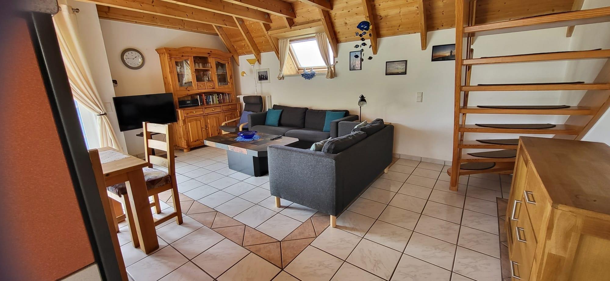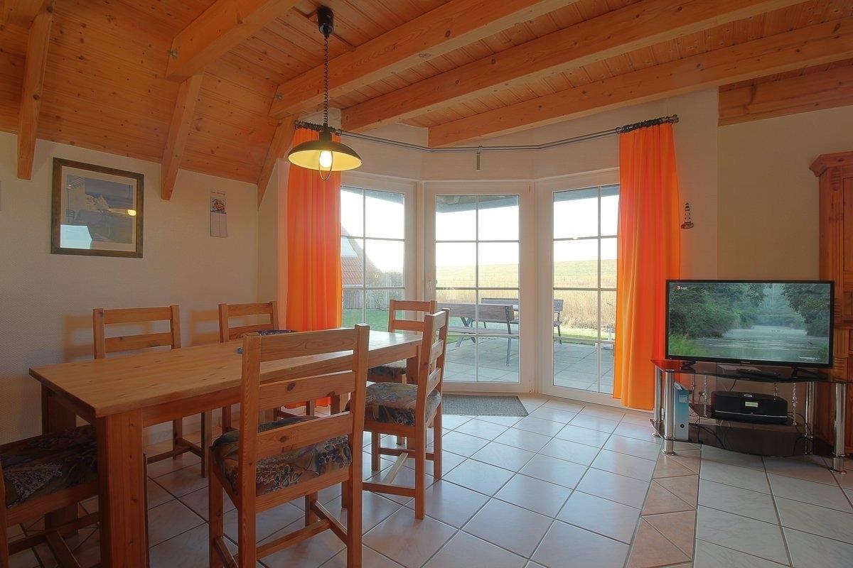 Im komplett gefliesten Wohnbereich gibt es einen offenen Wohnbereich mit Flat-TV, Essplatz und Küche mit komplett ausgestatteter Einbauküche mit Geschirrspüler, in der es an nichts fehlt. Vom Wohnraum aus geht es auf die sonnige Terrasse mit Abstellraum und Gartenmöbeln und tollem Blick auf den Deich.