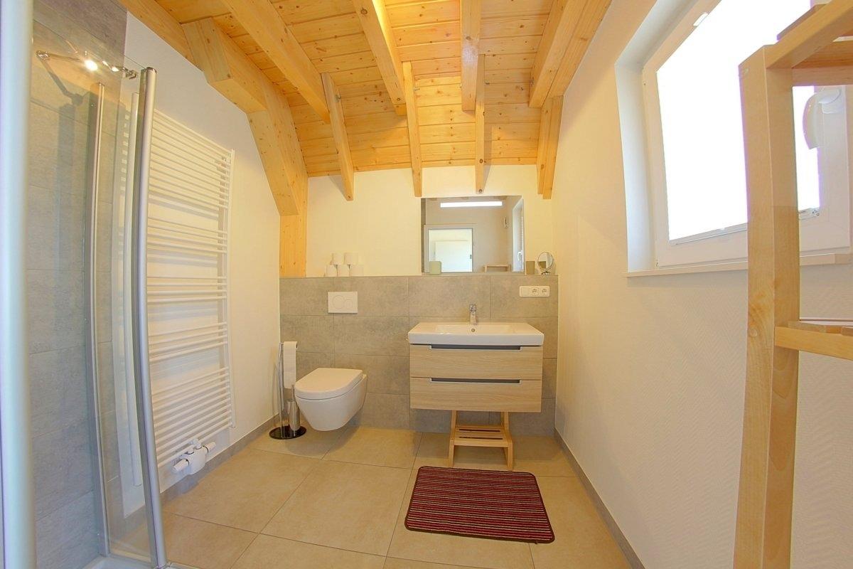 Das Badezimmer mit Dusche befindet sich im Erdgeschoss, ein 2. WC ist im Obergeschoss vorhanden.