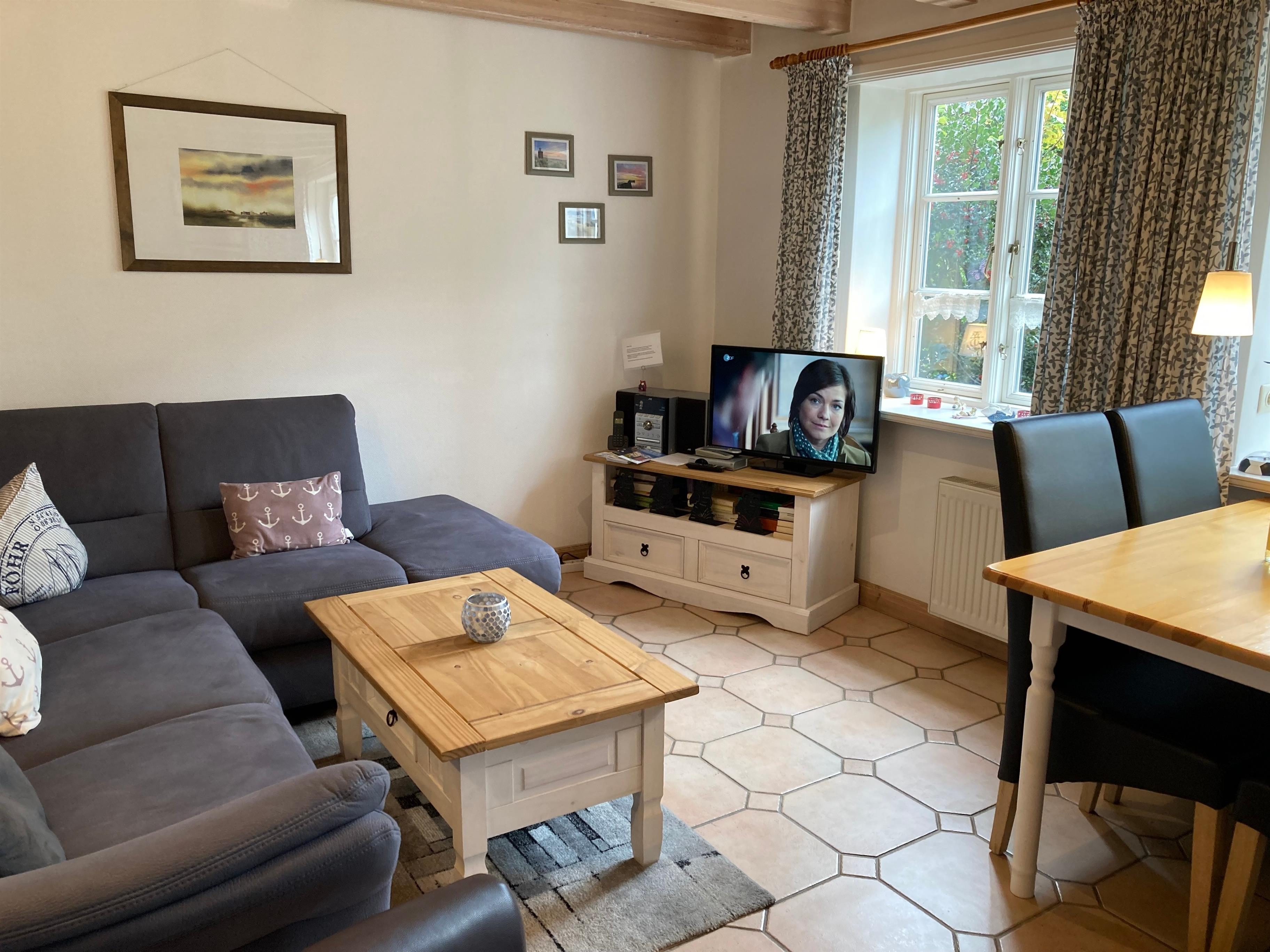 Im Erdgeschoss finden Sie ein helles und gemütliches Wohnzimmer mit Ecksofa, Flachbildfernseher, DVD-Player und Stereoanlage, sowie eine moderne Küchenzeile aus 2018 und den Essbereich.